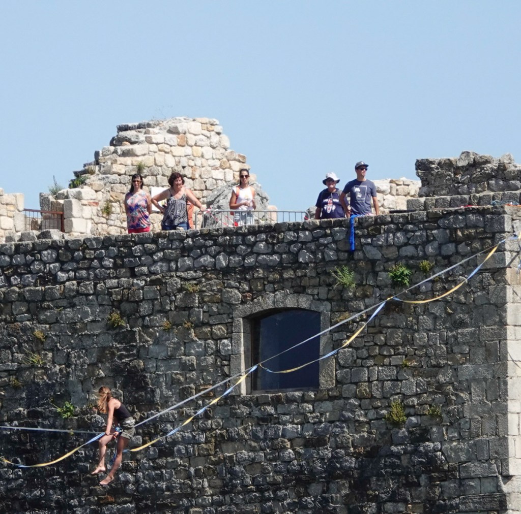 Opeens ontdekten we, dat beide punten, die toch wel een flink stuk uit elkaar lagen, met elkaar verbonden waren door een kabel hoog in de lucht en laat daar nu ook nog iemand overheen aan het lopen zijn van de kerk naar het fort. Wat een durfal op blote voeten!