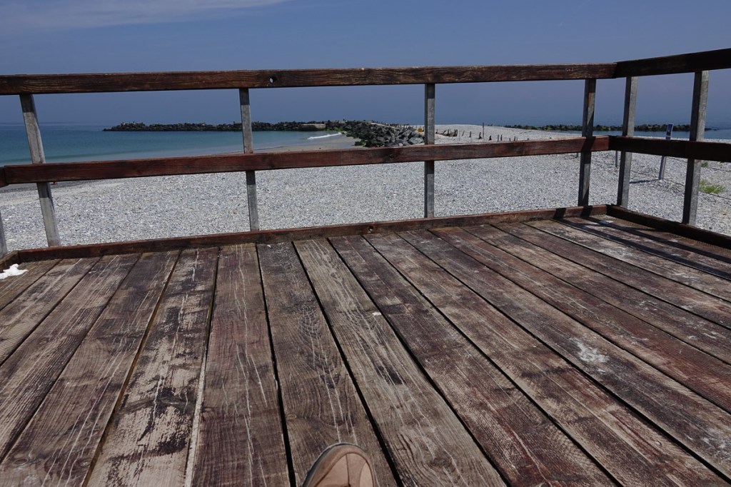 In mijn ooghoek zag ik een man aan komen lopen met een hoedje op en een felblauwe frisbee voor zijn geslacht. Ik dacht een zwembroekje om zijn heup te zien, maar toen de frisbee wat opwipte, zag ik zijn geslacht. Nee toch, ik heb op mijn leeftijd echt geen zin in een potloodventer. Die aandacht gunden we hem niet, dus keken we naar de zee en de mooie natuur. Helaas kwam hij toch op ons aflopen en beklom zelfs de trap van de uitkijktoren.