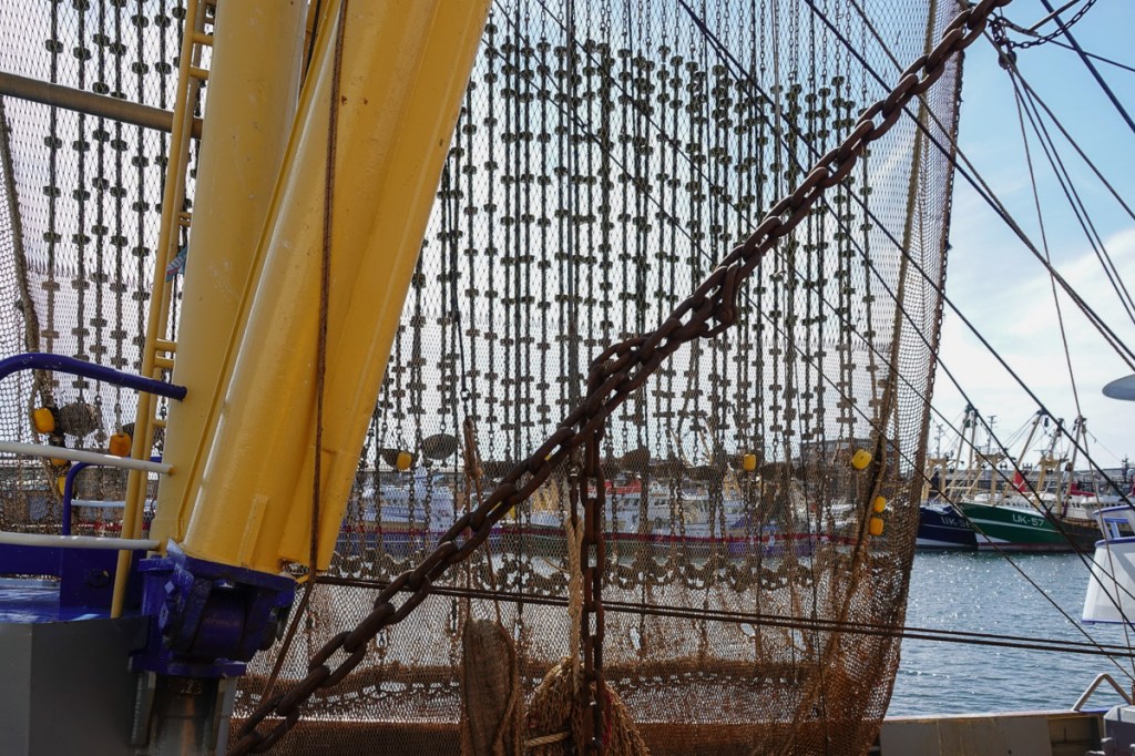 In de haven van IJmuiden hingen op een vissersboot de netten te drogen, die gebruikt worden bij het puls-vissen. Dit is een manier van vissen waarbij ze stroomstootjes gebruiken, die in deze sleepnetten zitten. Alles natuurlijk om een zo groot mogelijke vangst te hebben, want ja, een visserman moet ook leven. De netten slepen over de grond op zoek naar schol. Helaas gaat het vissen op deze manier zo rigoreus, dat de zee snel leeg raakt van vis, als men hier te lang mee doorgaat. Het is een omstreden manier van vissen. Er is ook een verbod op, maar men is steeds weer op zoek naar aanpassingen van het systeem, zodat het toch wel weer kan.