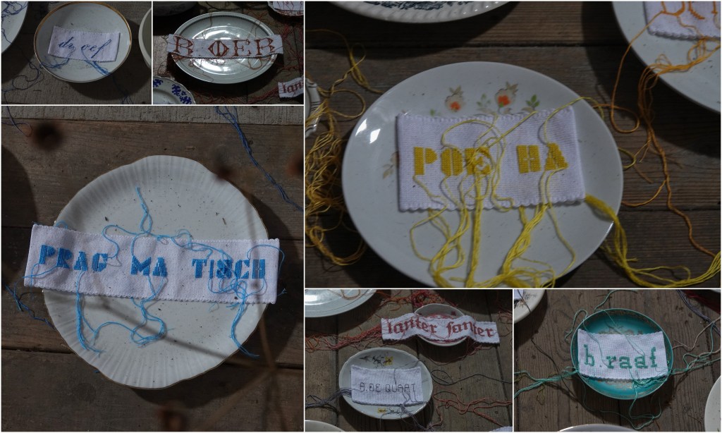 oud porselein en borduurwerkjes uitgevoerd met antieke belettering.