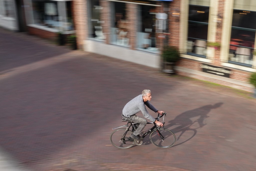 tot technische opdrachten, waarbij je oefent met de sluitertijd. De ene opdracht moest het resultaat zijn, dat je een bewegend iets scherp hebt en de achtergrond wazig. Dat is het zogenaamde ‘pannen’, dat ik wel vaker geoefend heb. Dit keer vanaf het bordes van het oude raadhuis van De Rijp.