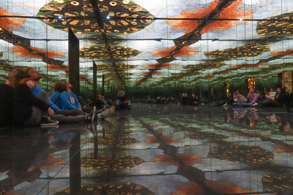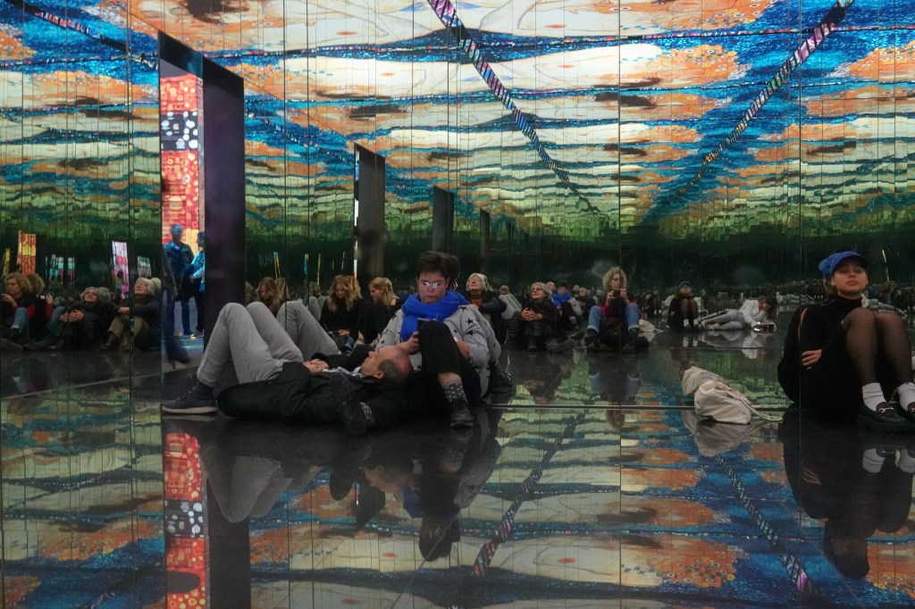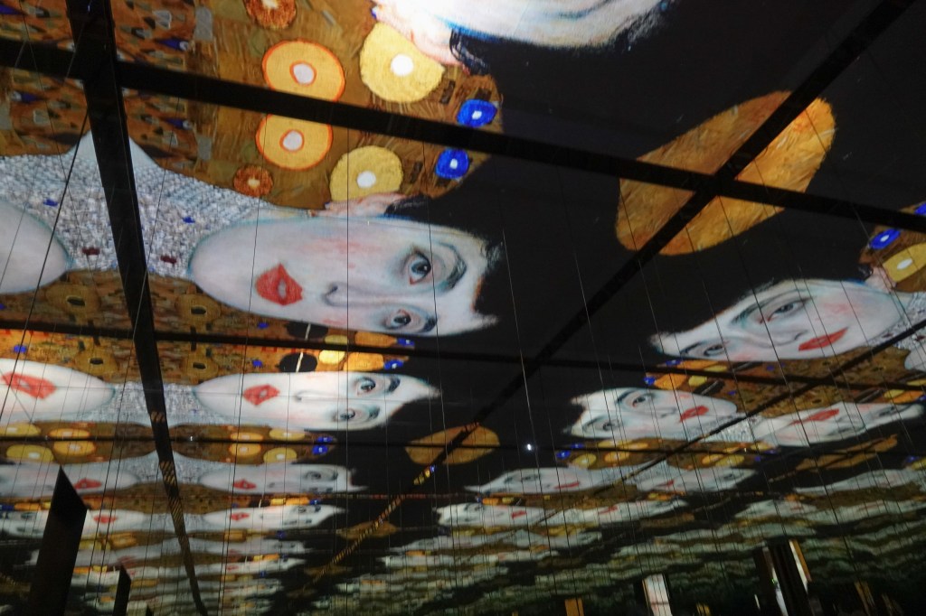 Bij de Fabrique des Lumières was een zaal vol spiegels, wat heel vervreemdend werkte. Doordat er niet veel licht was zag je niet waar je op stapte. De vloer was namelijk ook een spiegel, kortom een ruimte met overal spiegels, waar dan ook nog eens dezelfde projecties op te zien zijn dan in de hal eromheen. Dat was weer een heel andere gewaarwording. De prachtig afgestemde muziek bij al de verschillende kunstenaars en stijlen kwam hier nog eens sterker binnen.