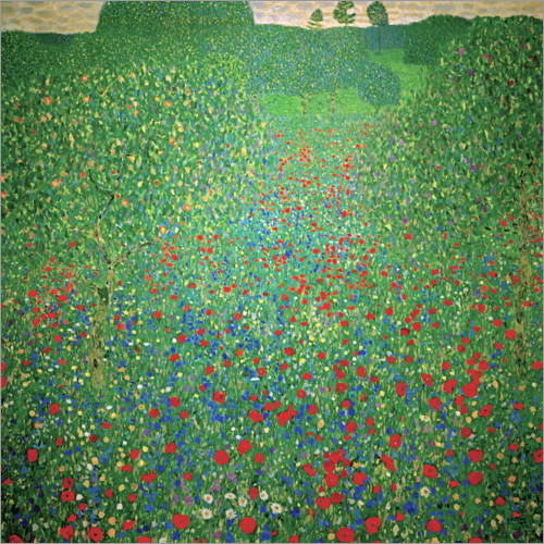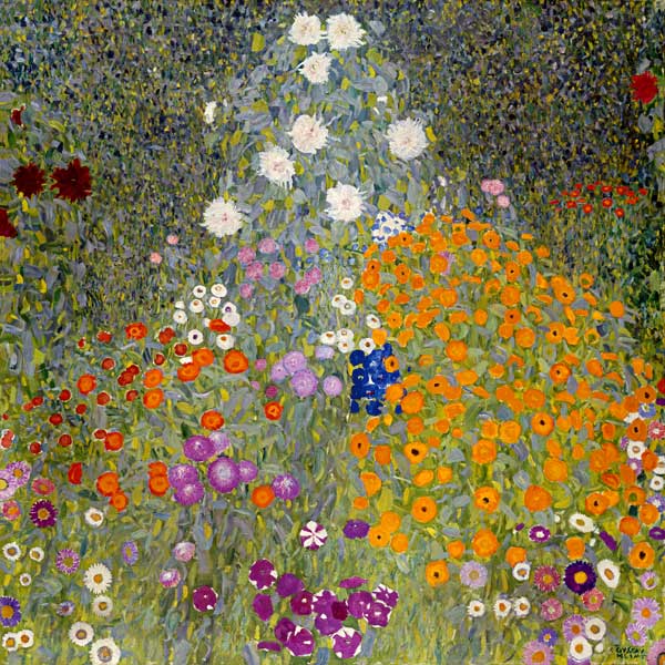 In een andere afgescheiden ruimte kon je de 30 schilderijen zien waarop de expositie is gebaseerd. Het zijn werken van allerlei Weense kunstenaars vanaf het einde van de 19e eeuw. Het is een stroming die met hun werk de fundamentele rol van de kleur illustreert en zoekt naar nieuwe vormen. Gustav Klimt is de bekendste, dus draagt de tentoonstelling zijn naam. Om even een indruk te geven hoe het op deze speciale expositie in zijn werk ging: dit is het schilderij ‘Veld met klaprozen’ in combinatie met ‘de bloementuin’.