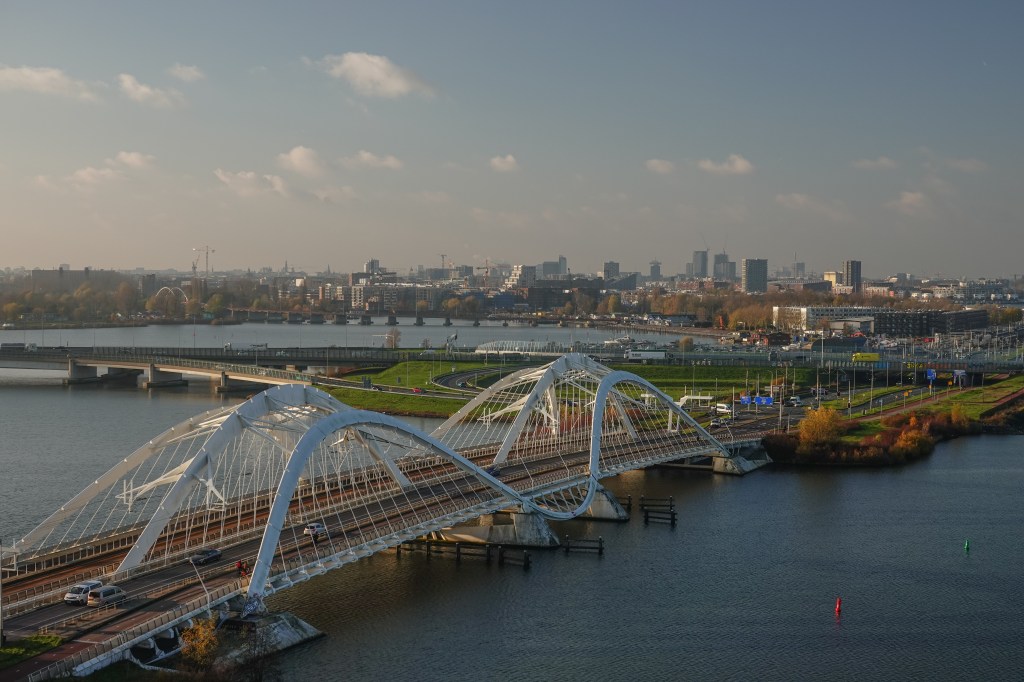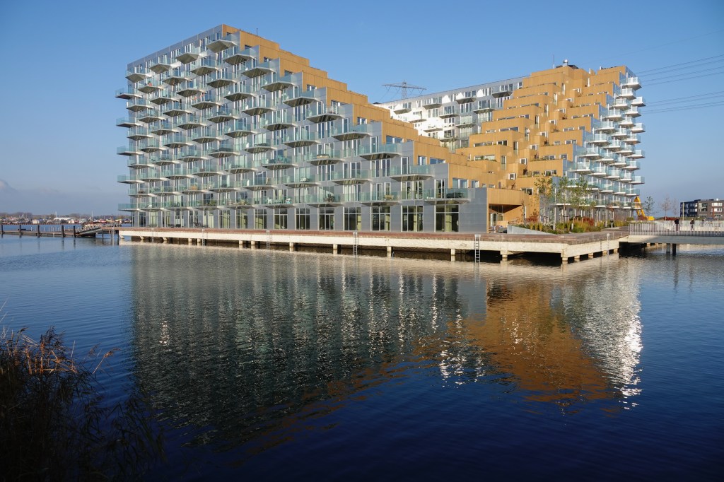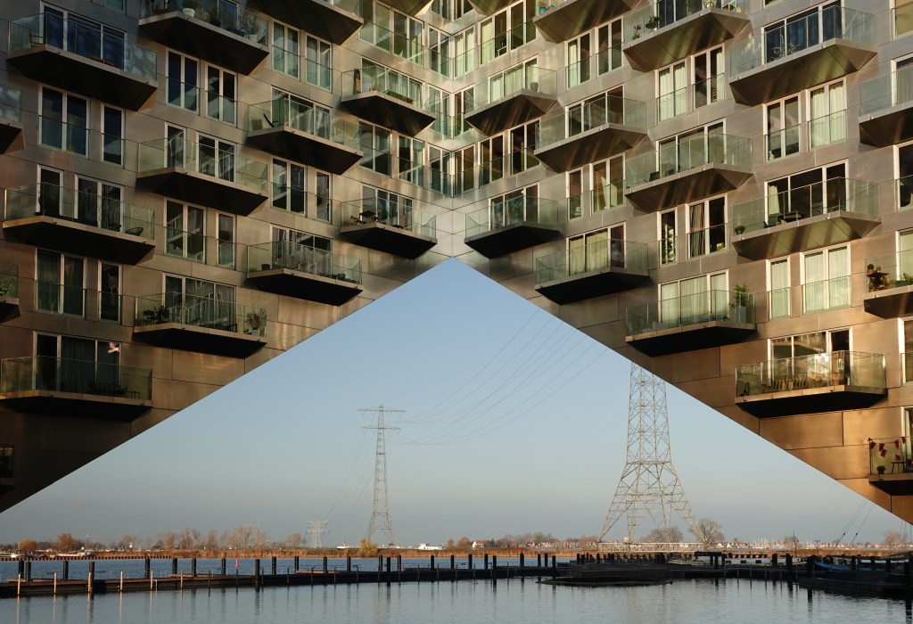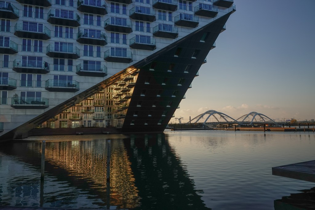 Heel veel fotografen zijn ons al voorgegaan. Dan denk je, wat heb ik aan al die gemaakte foto’s, die je langs ziet gaan op Facebook en Instagram nog toe te voegen? Maar ik heb geen tel spijt gehad van mijn uitstapje met wat fotomaatjes naar IJburg. Het is duidelijk, dat foto’s bekijken of lijfelijk aanwezig zijn op de plek toch een heel andere ervaring is. We waren daar gewoon op ontdekking van het Sluishuis. Je voelt en ziet hoe het gebouw is neergezet in de ruimte. Het is vanaf alle kanten interessant en fotogeniek. Je blijft kijken naar een onovertroffen lijnenspel.