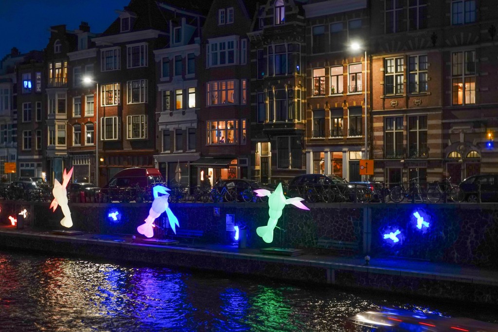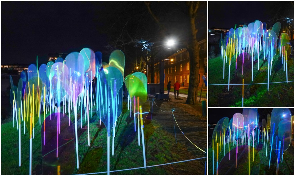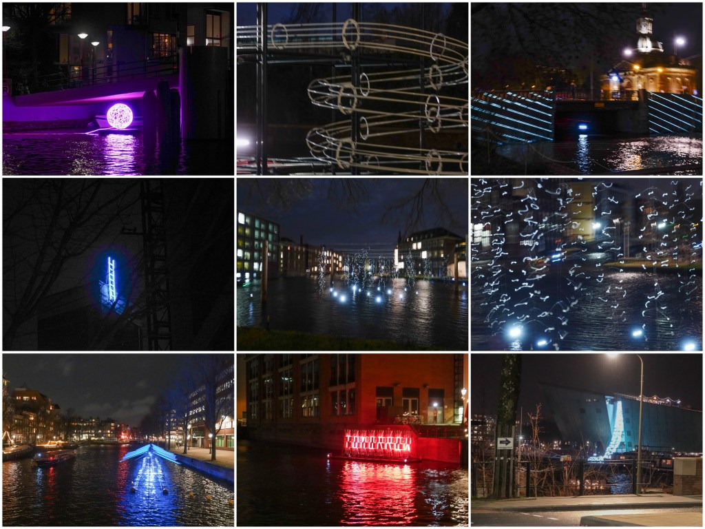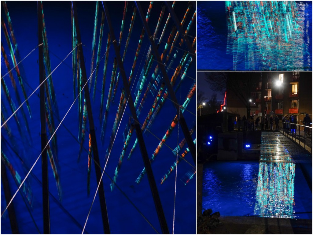 Na een lange regendag met opklaringen in de avond was een wandeling door Amsterdam best welkom. Dus ging ik met vriendinnen I en C naar het Lightfestival. We hadden een plattegrond van de route en ondanks dat zagen we niet alles. Zo’n onduidelijk kaartje heb je nog nooit gezien en daar betaal je nog €7,50 voor. Nergens straatnamen of namen van kenmerkende gebouwen. Alleen stonden de lightfestival- attracties in abstracte tekeningetjes aangegeven op de kaart. Helaas vaak net op een knooppunt van wegen, waardoor je niet kon zien hoe je moest lopen. Afijn, het was op sommige punten een gezoek van jewelste en dus hebben we soms niet gevonden wat we zochten. Het begin -en eindpunt was voor ons op de Prins Hendrikkade met de bushalte binnen handbereik. Richting Entrepot doc zagen we als eerste een soort schorpioenen tegen een kademuur.