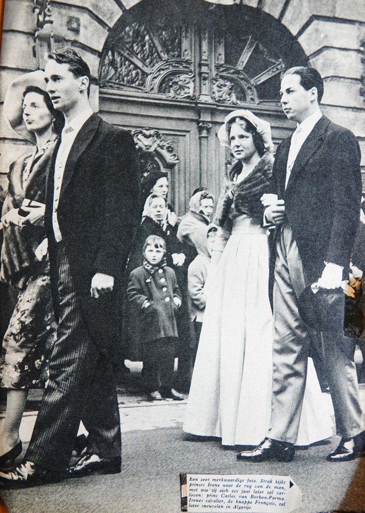Deze foto licht ik er even uit, omdat ik hem zo grappig vond. 6 jaar voordat ze trouwde liep prinses Irene in een stoet achter haar toekomstige echtgenoot prins Carlo de Bourbon Parma, met een heel andere metgezel.