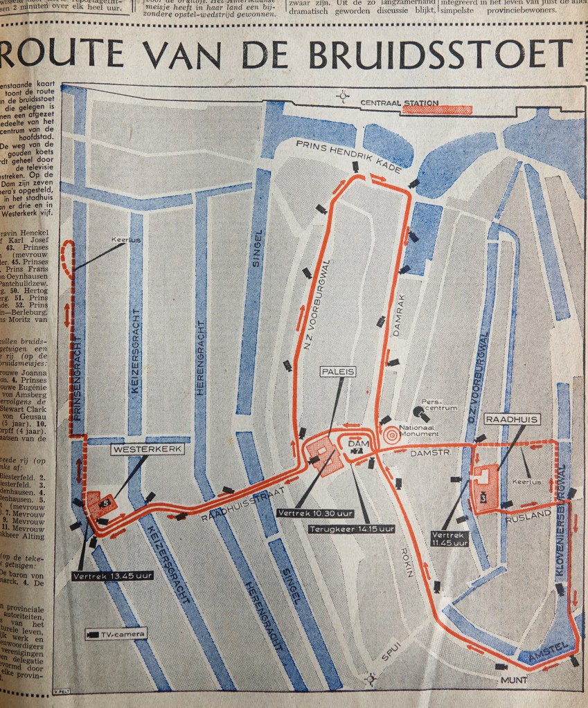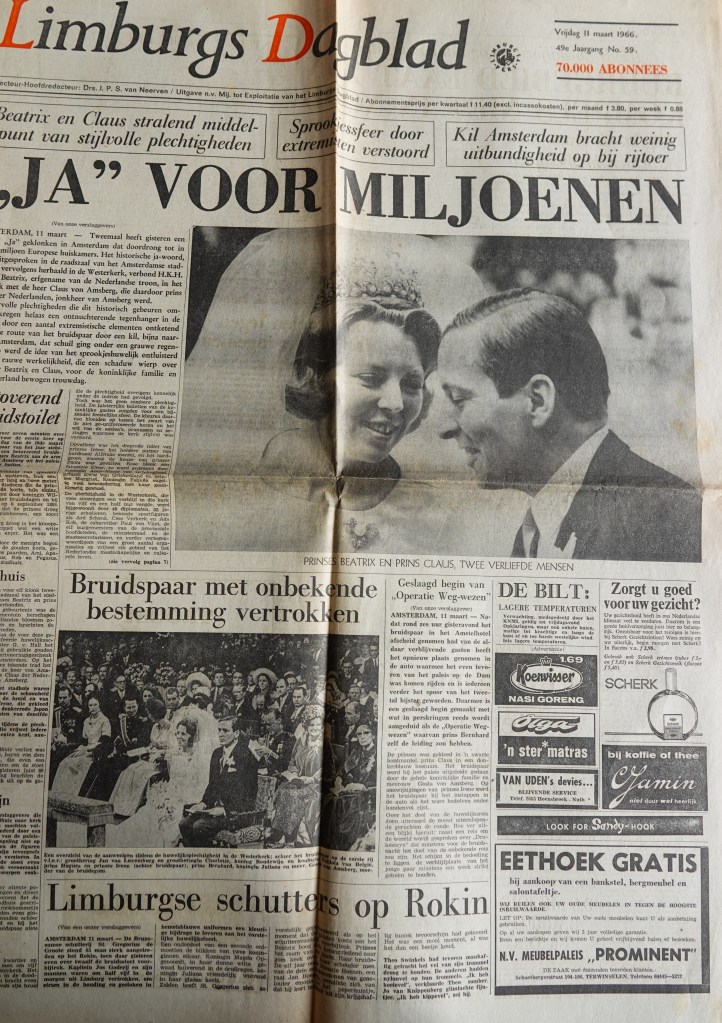 Krantenartikelen, zoals de route van de bruidsstoet van Beatrix in 1966 uit de Volkskrant