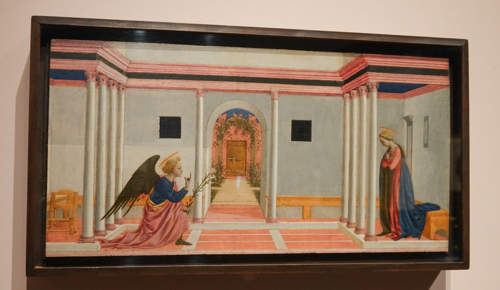 De annunciatie van Maria (de aankondiging aan Maria door de aartsengel Gabriël dat zij op maagdelijke wijze zwanger zal worden) in een traditionele voorstelling met lijnperspectief