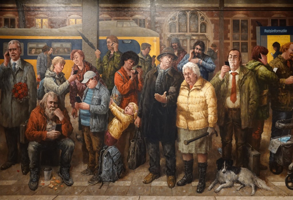 Op de bovenetage was het werk te zien, waarmee Marius van Dokkum bekend is geworden. Hij is een mensenkijker en dat zie je terug op de humoristische schilderijen. De toeschouwers liepen hier glimlachend rond.
