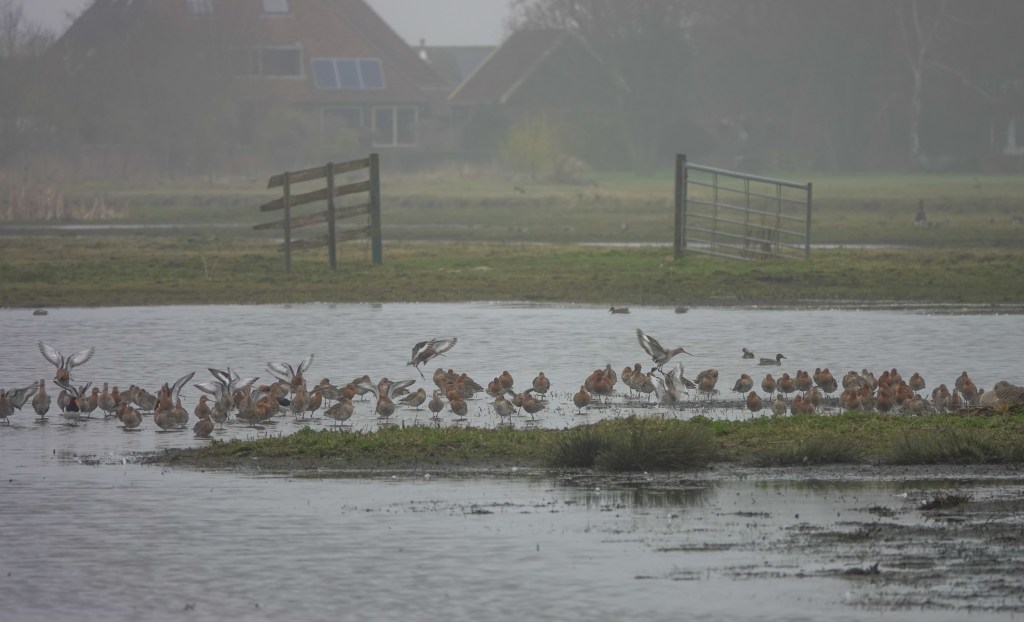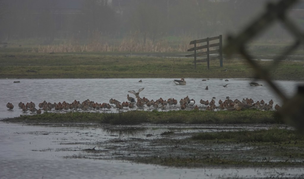 Toen we heengingen wisten we nog niet van het bestaan van the Big Five. We hoopten eigenlijk het meest om grutto’s te zien. Al snel zagen we wat enkelingen staan in de ondiepe slootjes en in de weilanden. Maar er bleek nog een stuk land te zijn met veel ondiep water en daar zat warempel nog een hele groep bij elkaar. Weliswaar wat ver weg voor ons om met dit grijze weer een scherpe foto voor elkaar te krijgen, maar het was evengoed een mooi gezicht.