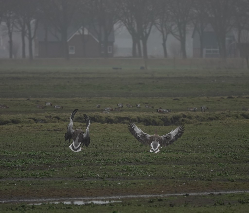 en ganzen in de weilanden. Hier zijn een paar grauwe ganzen bezig met de landing. Ook leuk, want wie heeft bepaald welke vogels tot the Big Five behoren?