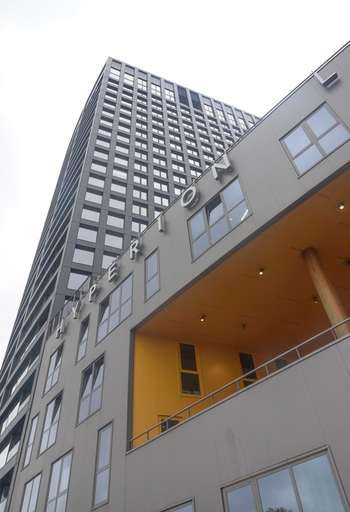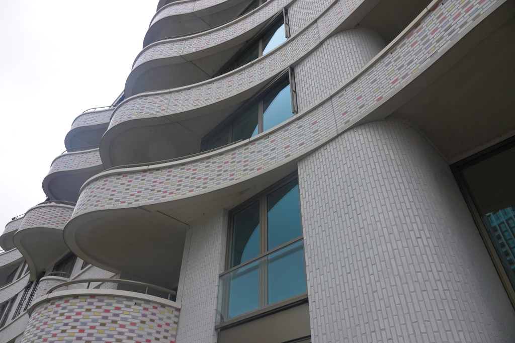 Het ene woonblok is hier nog aparter dan het andere. Ze hebben ook allemaal een naam. Gebouw ” the Wave’ bekeken wij nader. Niet omdat we het nou zo mooi vonden, maar er was wel van alles te zien.