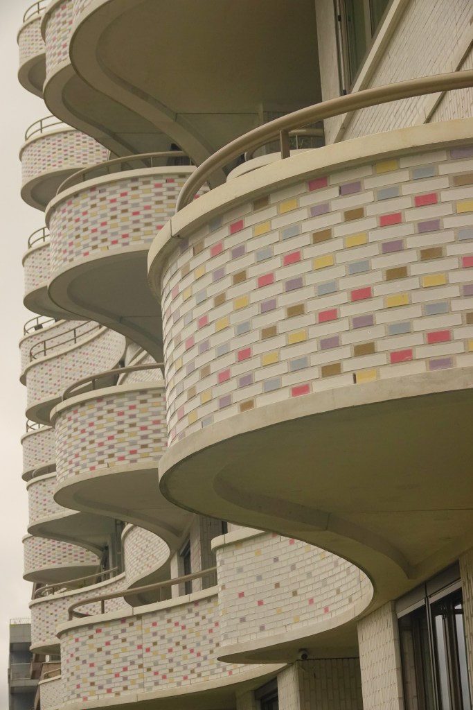 Voor mij zijn het de golvende balkons en de gekleurde stenen daarin.