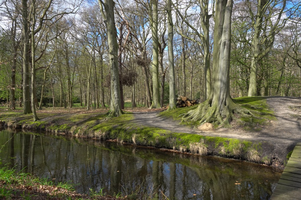 De wolkenluchten, het landhuis en het moderne museumgebouw, leveren samen met de waterpartij een mooie aanblik op.
