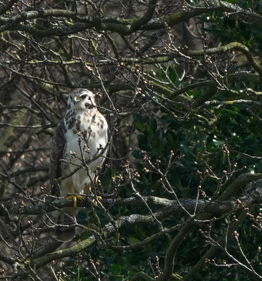 Boven het weidse land kreeg ik een roofvogel, een buizerd, in het vizier die in een boom ging zitten op een net nog acceptabele afstand voor de foto.