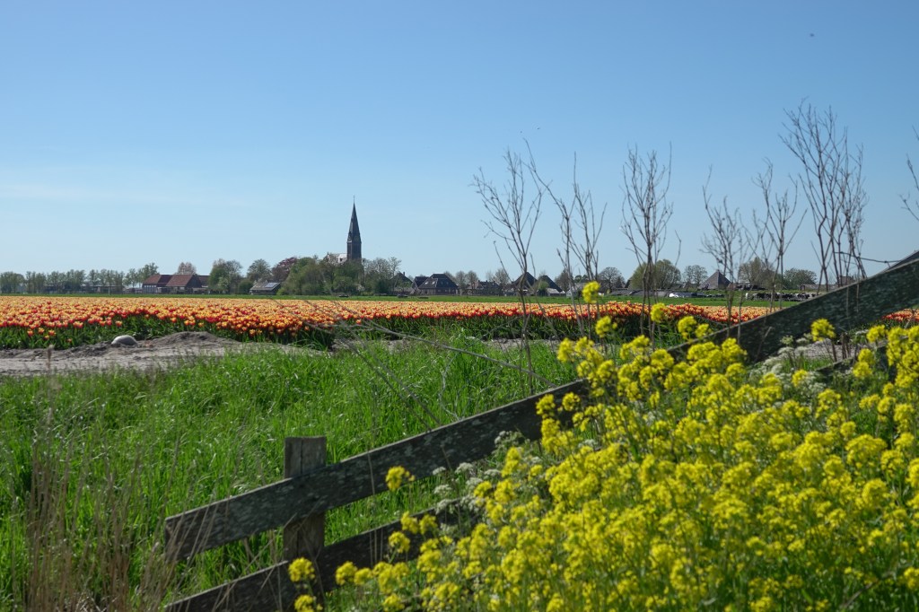 We reden verder door de mooie dorpjes in het West-Friese land, maar onze ogen speurden naar bollenvelden met een mooi decor erachter. Een paar keer stapten we uit. De eerste keer voor de koeien. De windmolens namen we maar voor lief.
