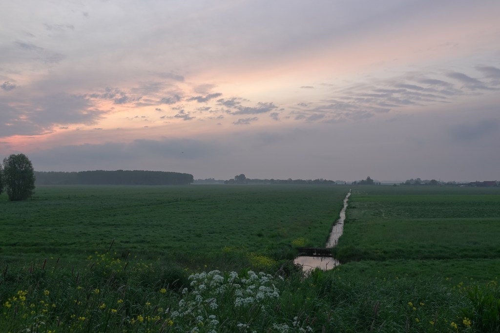 Toevallig kwam het zo uit, dat na de zaterdagochtend ook op zondag van dit weekend de wekker voór half 6 afging. Dit keer pakte ik de fiets om naar het Purmerbos te gaan. Onderweg moest ik even stoppen om de ochtendstond vast te leggen. Iets meer bewolkt dan de dag ervoor, maar evengoed windstil weer en niet erg koud.