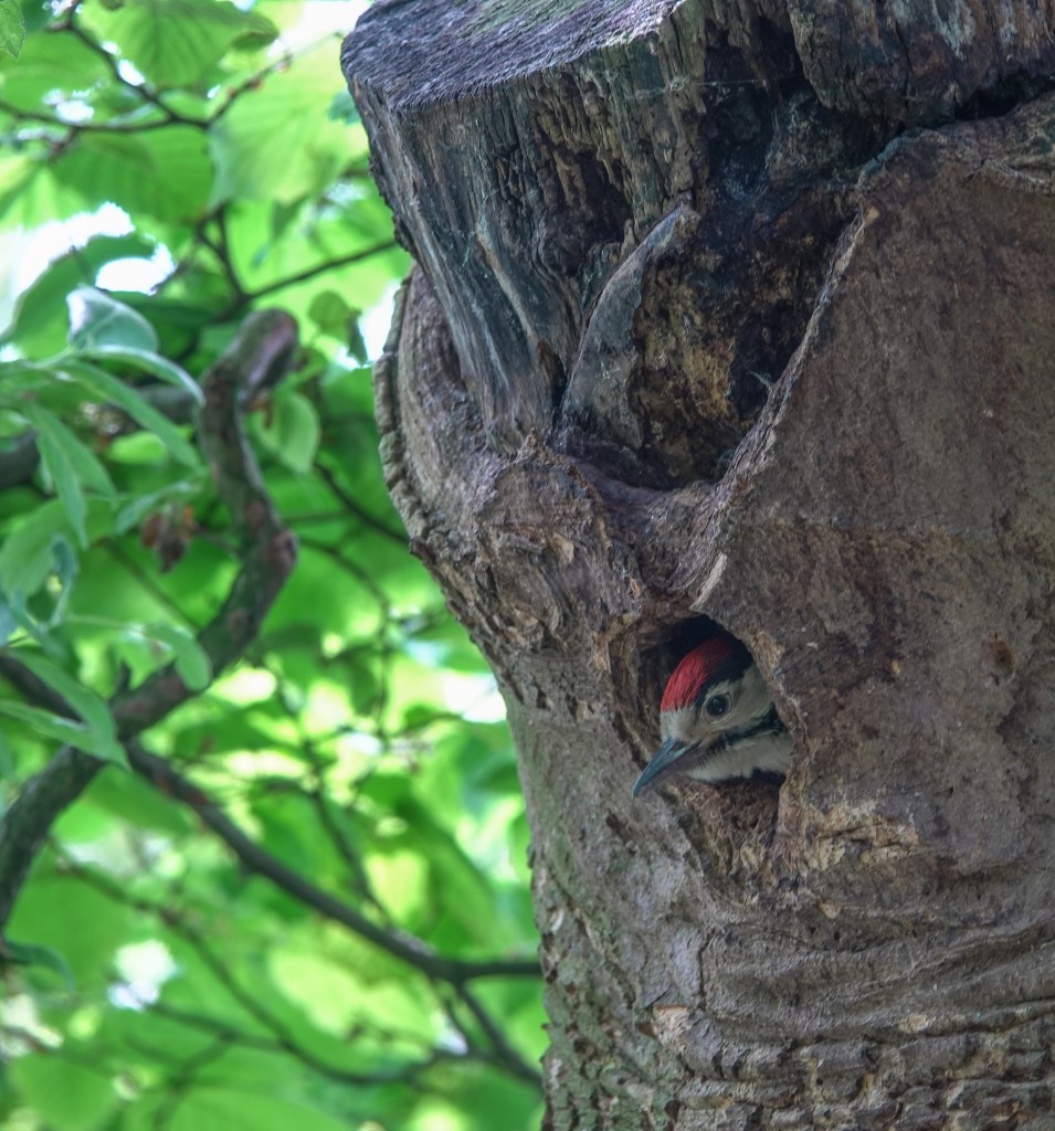 Toen attendeerde een honden-uitlater mij op een spechtennest met een jong, dat steeds met zijn kopje naar buiten piepte. Zo leuk!