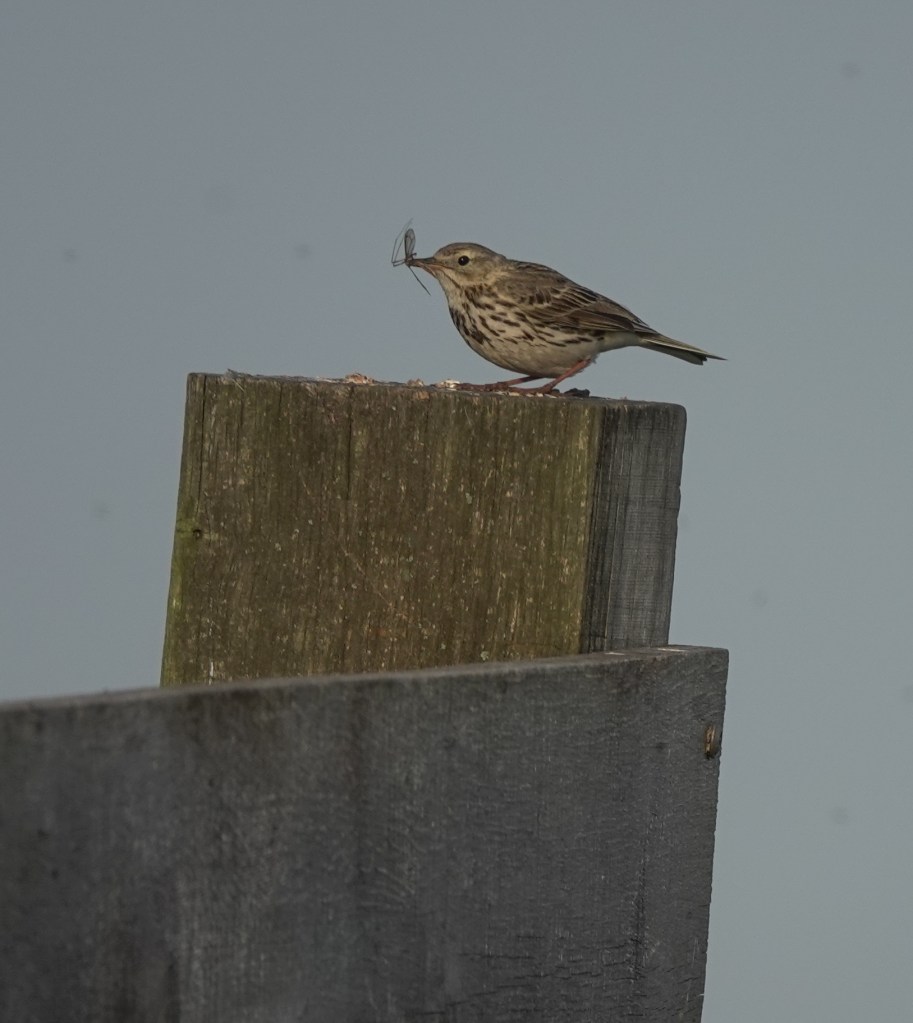 Wat betreft de vogels was het eerst heel rustig, dat is wel een verschil met ’s morgens vroeg. Maar toch hebben we veel gezien en werden we keer op keer verrast. Zo zat daar deze graspieper met insect