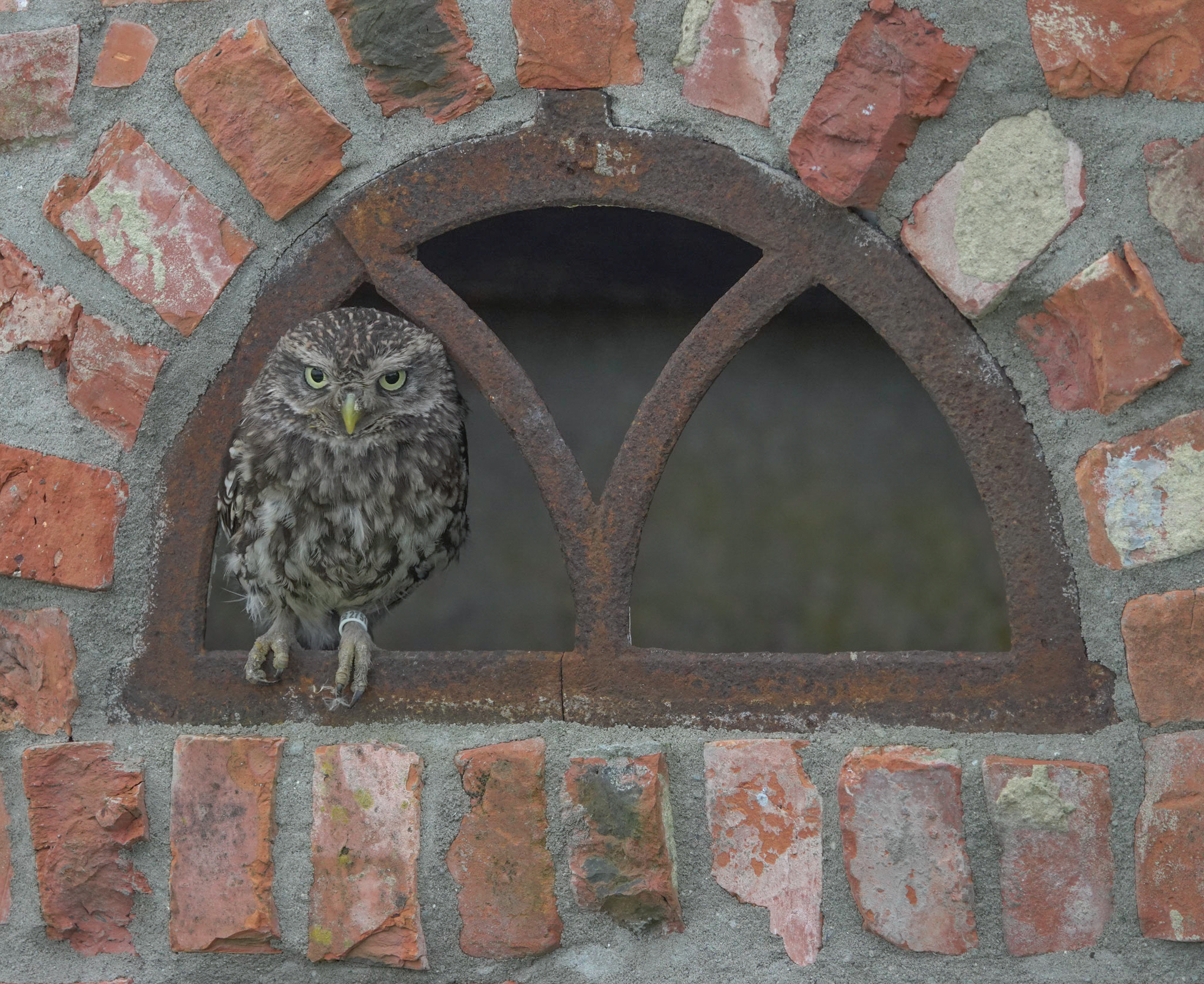 Een klassieker is de steenuil. Helemaal zoals hij daar in dat decor van zo’n schattig stalraampje zit. Het maakt hem aaibaar, maar doe maar niet. De Steenuil is een kleine gedrongen vogel en zijn lengte is ongeveer 21 tot 27 cm en heeft een spanwijdte van ongeveer 53 tot 58 cm. De bovenzijde is bruingrijs, dicht wit gevlekt en -gestreept. De onderzijde is lichtgrijs met donkere brede strepen.