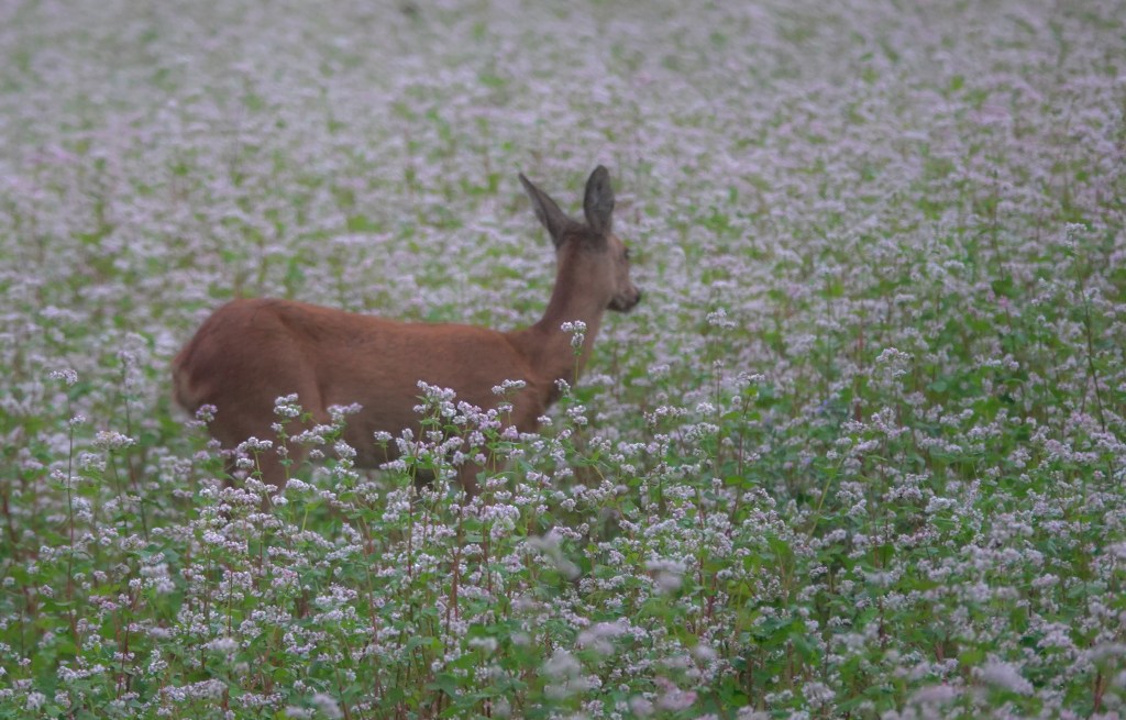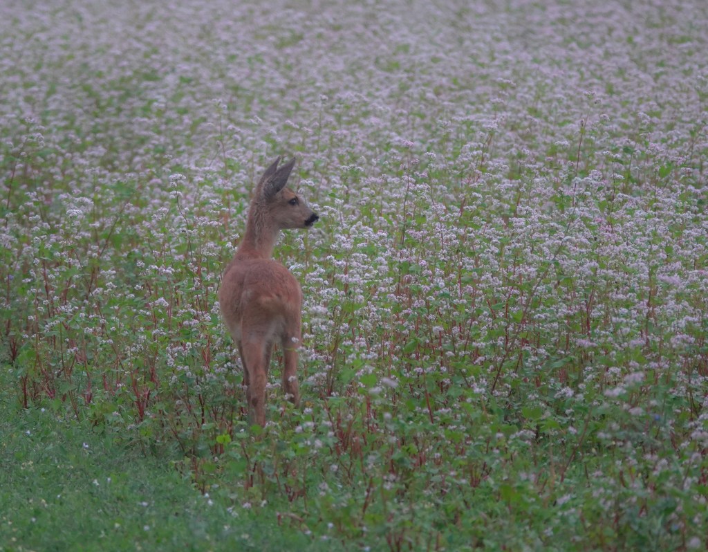 Leuk, maar nu moesten ze nog in het boekweitveld gaan. De schuwe dieren hadden ons al snel in het vizier en sommigen maakten meteen rechtsomkeer. Gelukkig liepen een paar durfallen wel de goede richting op en konden we helemaal aan ons trekken komen, zo op de late avond.