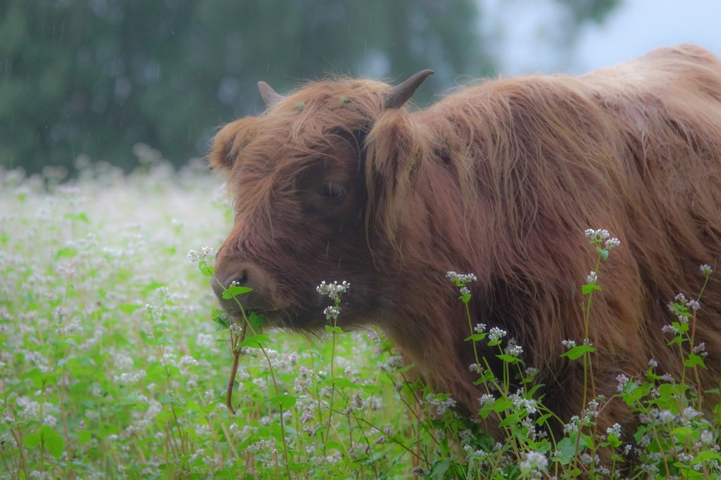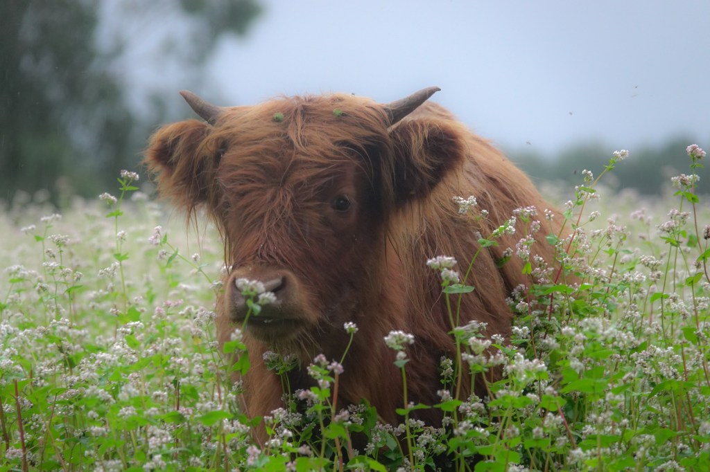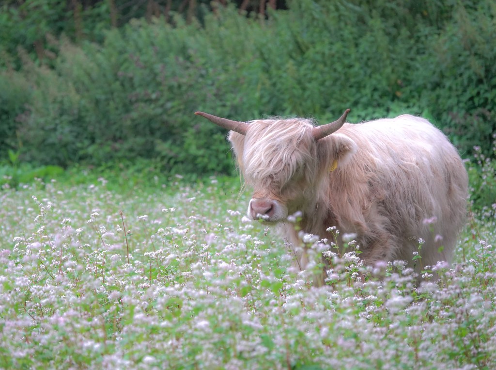 Toch zagen we al snel een paar ruggen. Dichterbij gekomen bleken het Schotse Hooglanders te zijn. Niet echt waar we voor gekomen waren, maar de dieren bleken goede modellen te zijn in het boekweit decor, een leuk alternatief. Er was een lichtgekleurde