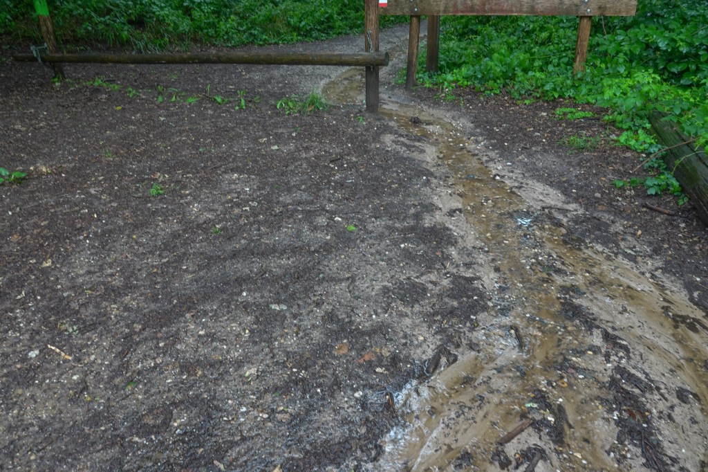 Opeens brak de hemel open en kregen we een stortbui over ons heen. We zochten ons heil onder de bomen in het bos. Maar voordat we goed en wel onze regenkleding aanhadden, plensde het net zo hard onder de bomen als daarbuiten. Bliksem en donder vergezelden de hoosbui, dus konden we niks anders dan onder de paraplu wachten tot dit natuurgeweld voorbij was.