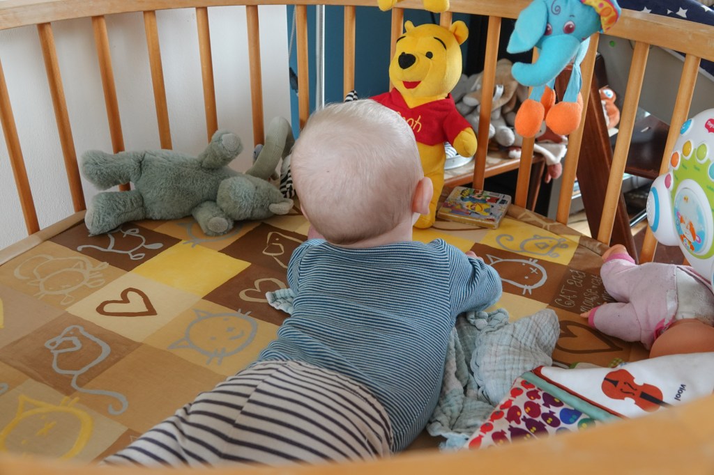 Onwennig, want ik was alles vergeten. Maar ik had een korte bijspijkercursus gehad van mijn dochter en daarom durfde ik het aan. Nu weet ik weer aan den lijve wat voor een enorme handenbindertjes baby’s zijn. Alles gaat om eten en slapen en als je denkt, nu zit zijn buikje vol en is ie wel voldaan, dan duurt zo’n moment zo enorm kort. Bovendien begint ie binnen de kortste keren te spugen. Deze jongen vind rollen naar zijn buik erg leuk, maar kan dan niet terug. Kortom je hebt het gevoel handen tekort te hebben, je staat echt de hele dag aan.