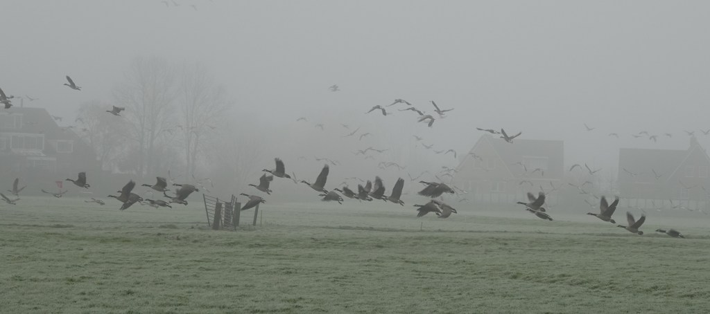 We hoorden veel ganzengeluiden. De weilanden zijn natuurlijk hun foerageer-terrein. Af en toe kregen we ze in zicht.