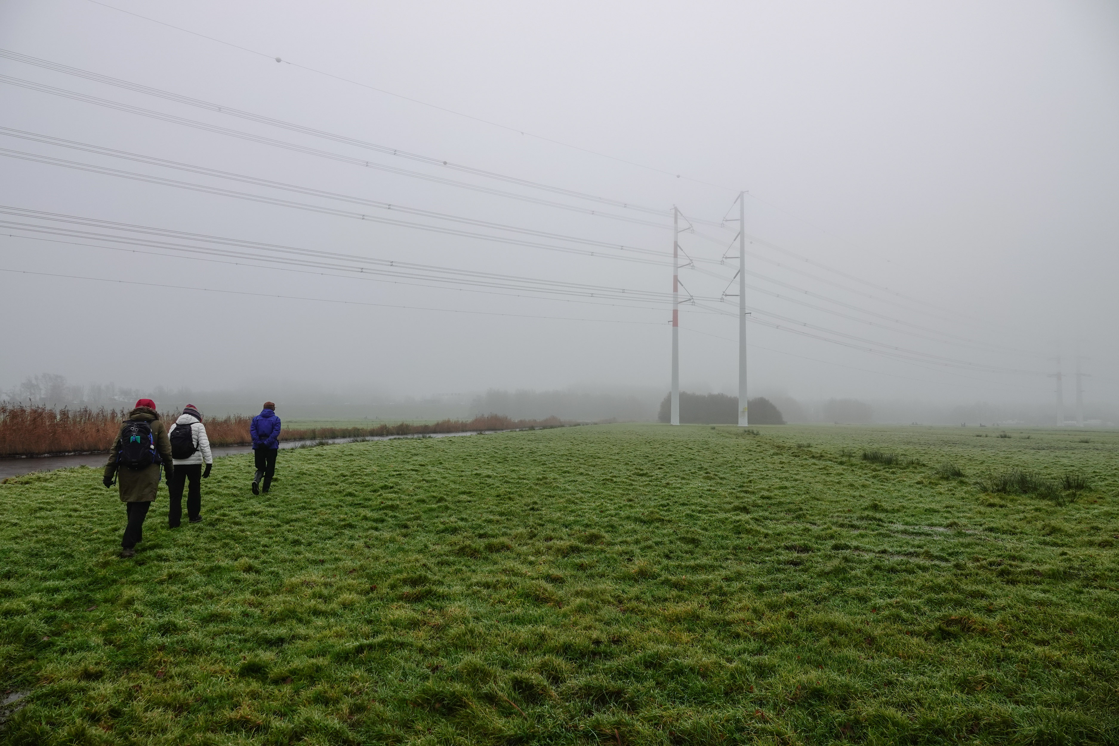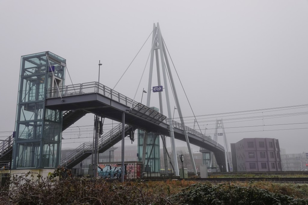 Daar gingen we de mist in. Ik hou ervan om in zo’n kleine wereld rond te lopen. Er waren geen contouren van de verstedelijking aan de horizon. Het lijkt heel verstild, maar als je daar bij Haarlem-Spaarnwoude wandelt weet je dat er altijd geluiden van een snelweg of vliegtuigen te horen zijn. Maar deze dag kon er hier niet gevlogen worden. Je zit middenin Randstedelijk gebied en het is verbazingwekkend hoeveel groen er toch nog is. Langs het spoor moesten we onder wat wegen door, waar we overal kapotte brommers en scooters zagen liggen, wat een verpauperde indruk gaf.