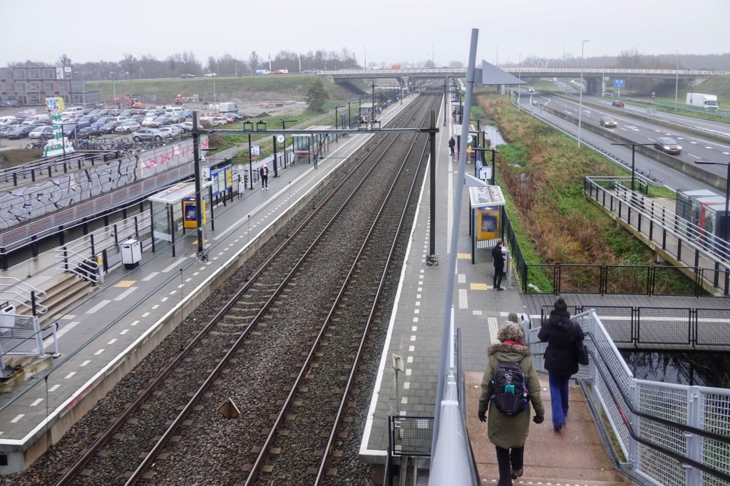 Bij station Haarlem-Spaarnwoude had ik afgesproken met een groep wandelaars. Het wachten was op onze gids, die de trein had gemist. De temperatuur was onder nul, dus best koud om te moeten wachten in een open bushokje. Gelukkig is er een grote frequentie aan treinen en voordat we ál te verkleumd waren stond hij al voor onze neus.