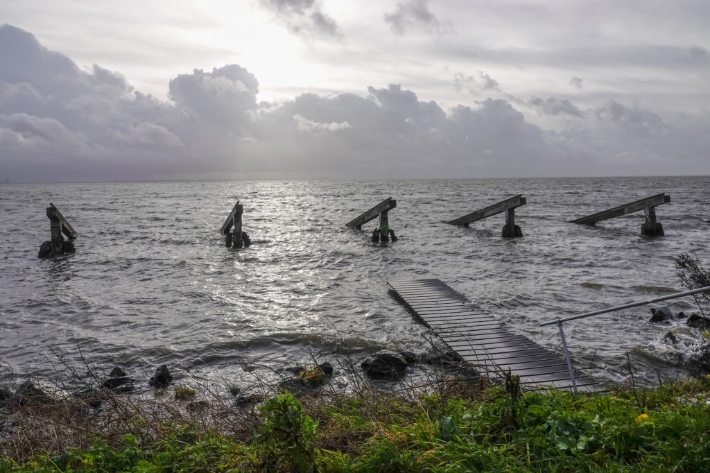 Van dichtbij zien we, dat het pad, dat de verbinding met de wal is, weer droog is. We hadden begrepen, dat de bewoners een paar dagen geleden met laarzen aan door het water moesten waden, maar gelukkig is het dus weer aan het zakken.