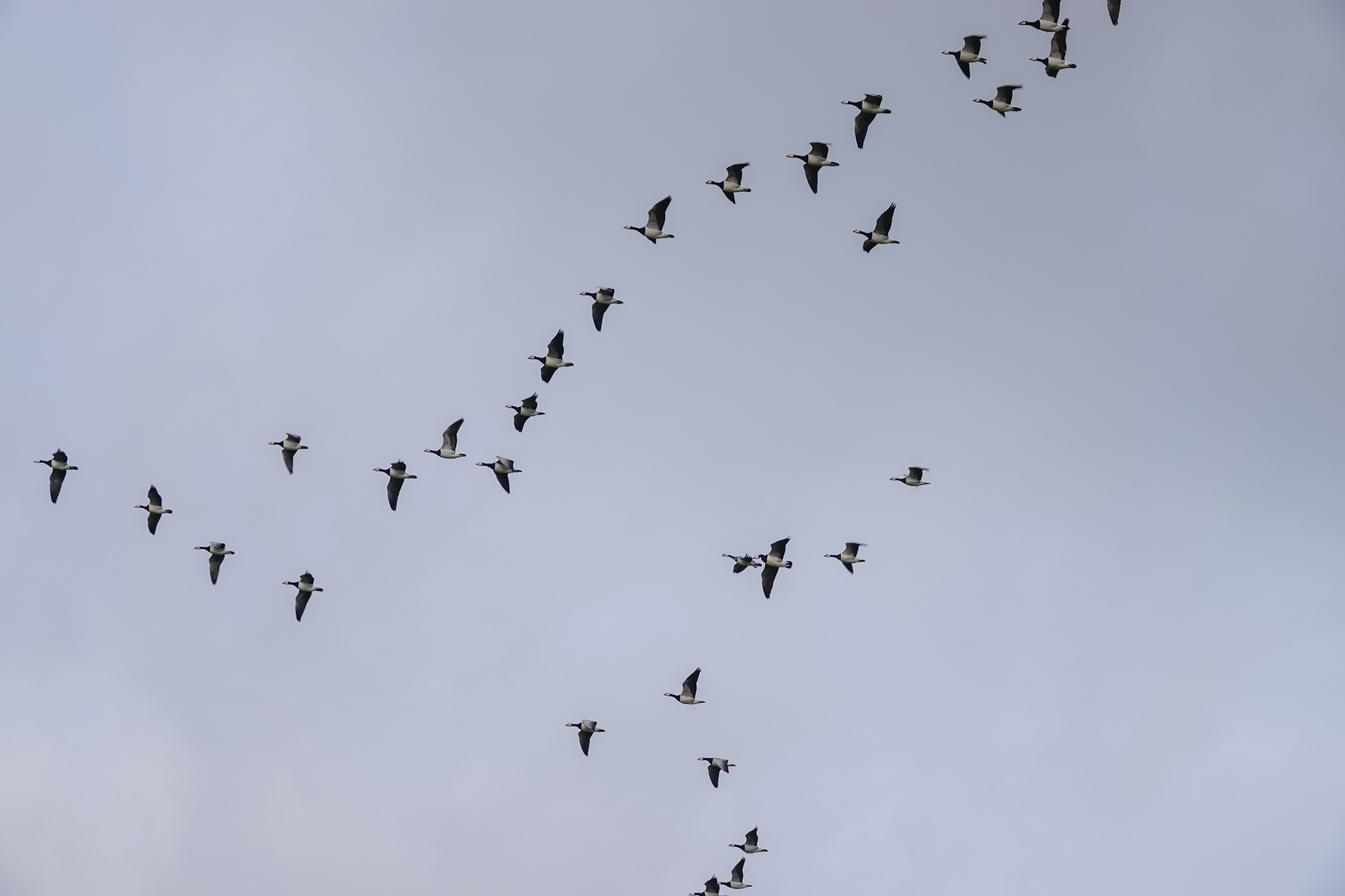 In de weilanden is het drukte van belang. Brandganzen zijn hier aan het verzamelen.