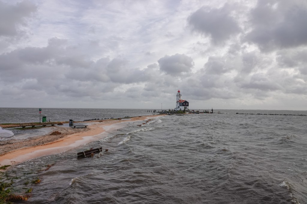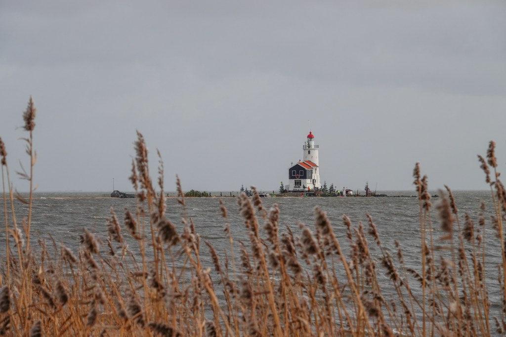 De vuurtoren, het zogenaamde Paard van Marken, is in ons zicht veld, dus lopen we daar over de dijk heen.