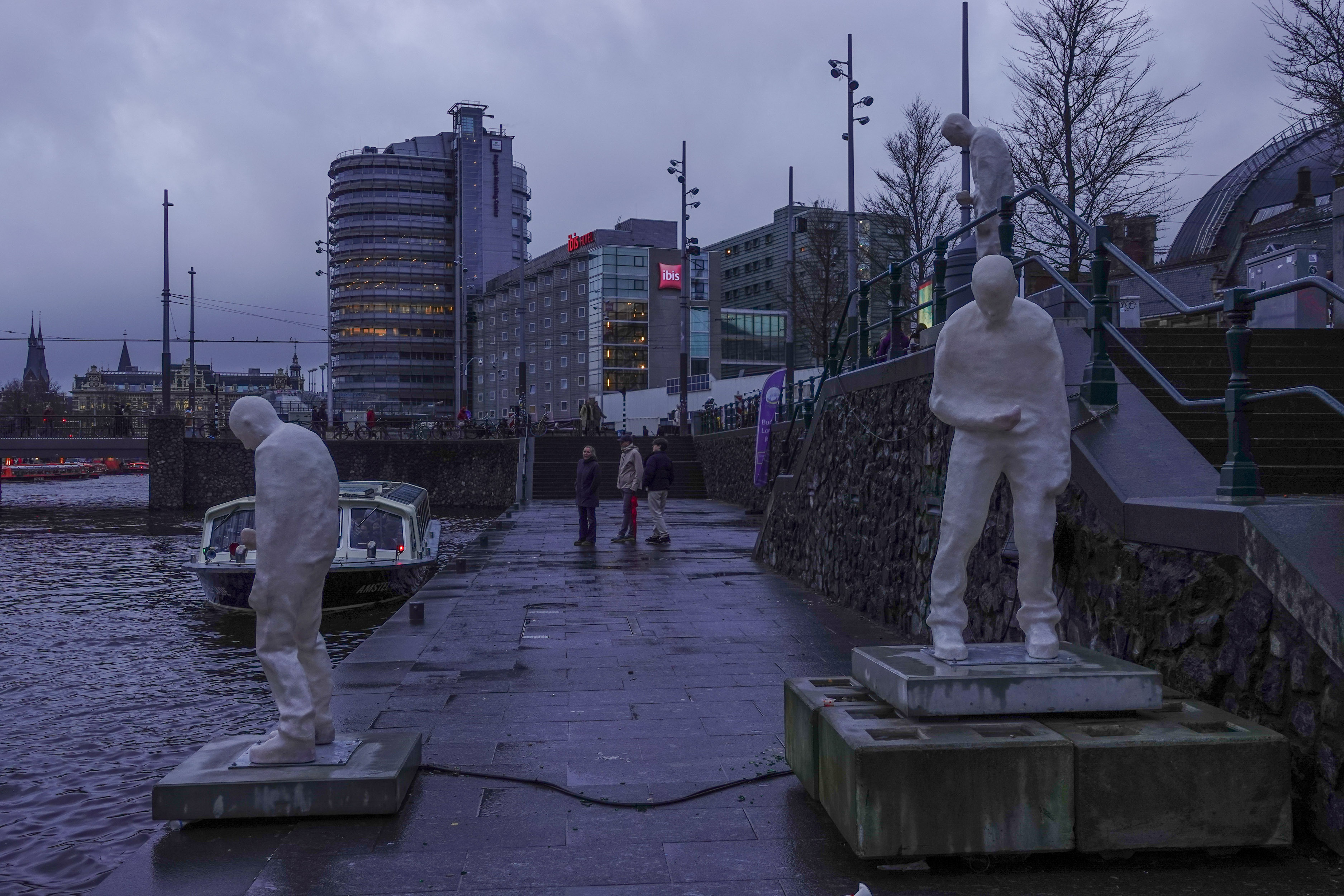 M en ik hadden bedacht, dat we ons al eens gingen oriënteren op het Light festival in Amsterdam voordat we er met een grotere groep fotomaatjes naar toe gaan. Er zijn immers teveel objecten om langs te gaan en te fotograferen op één avond. Wij hoopten dan te weten waar de mooiste of interessantste lichtbeelden te zien zijn. Vóór het CS stonden mannetjes die druk bezig waren met hun mobieltjes. Het schemerde nog, dus van verlichting was nog geen sprake, maar ze hoorden toch wel bij het Lightfestival.