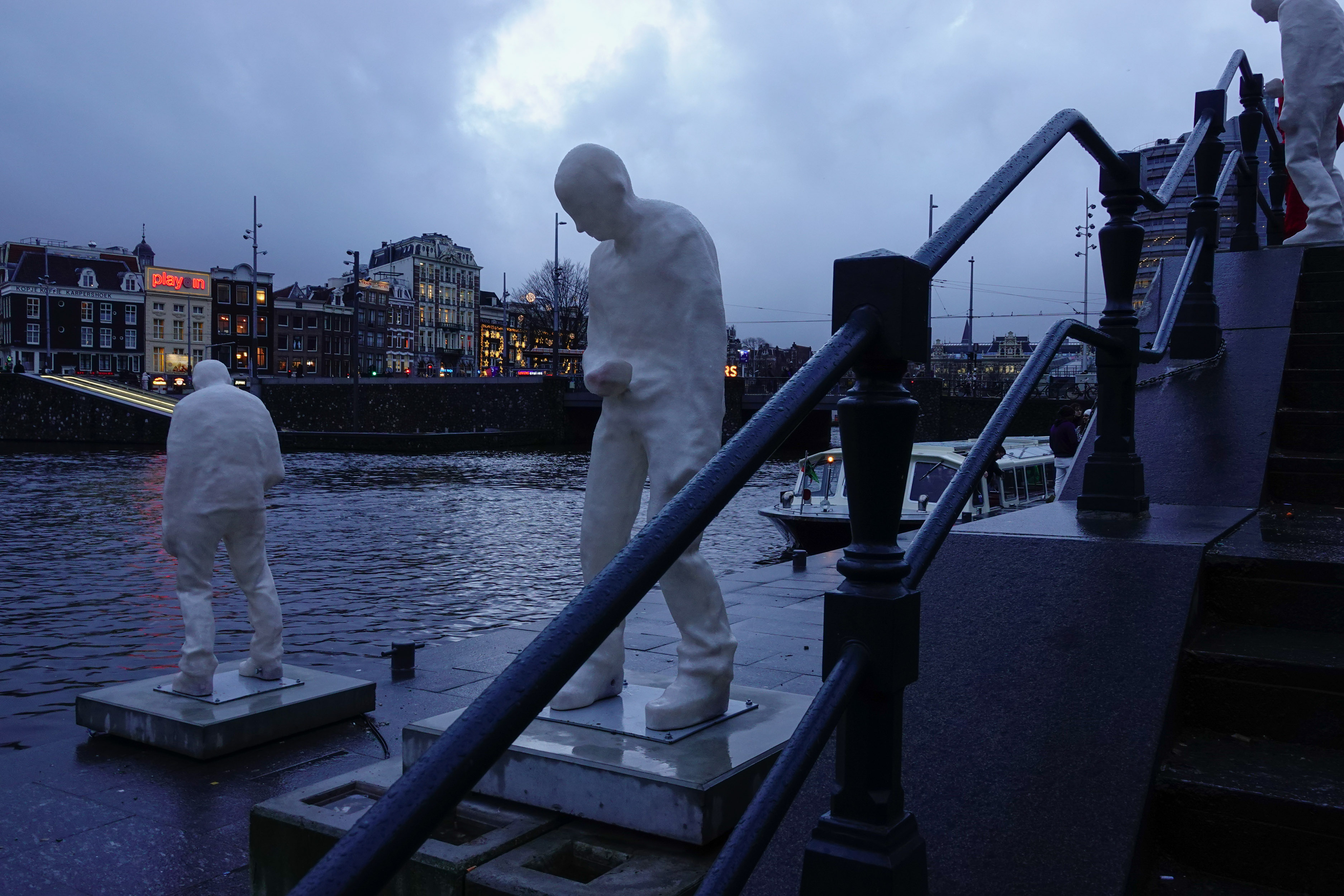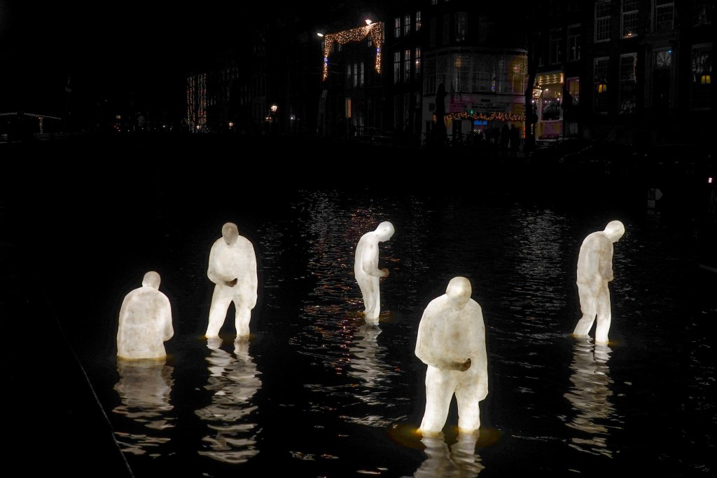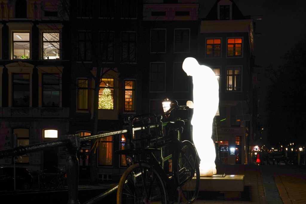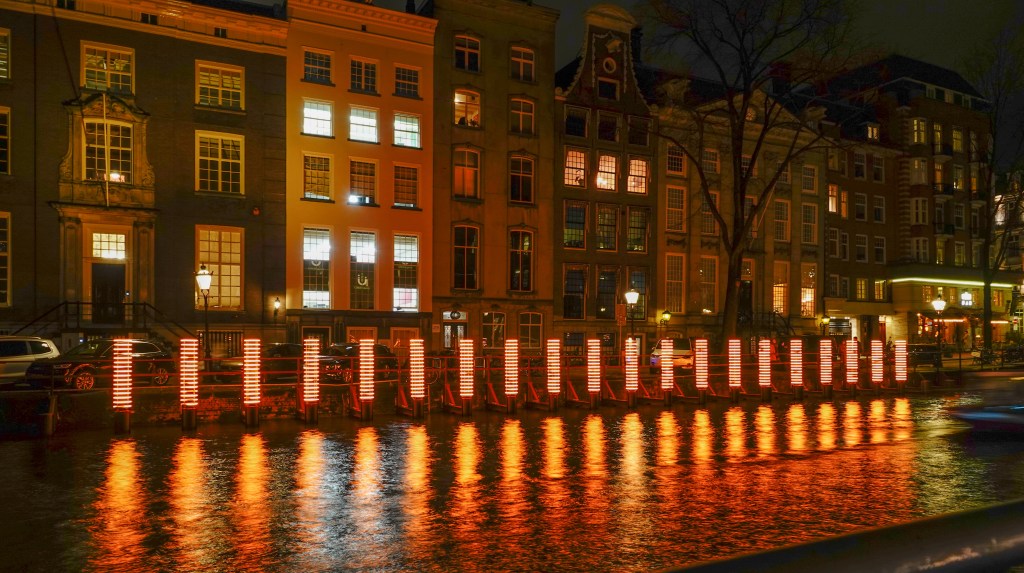 Meer dan dit ene object zagen we niet. Misschien namen we bij de Metro toch de verkeerde uitgang, want dit was niet echt de route. Wel zagen we allerlei leuke verlichte stadsbeelden. Aan de Amstel blijft het mooi.