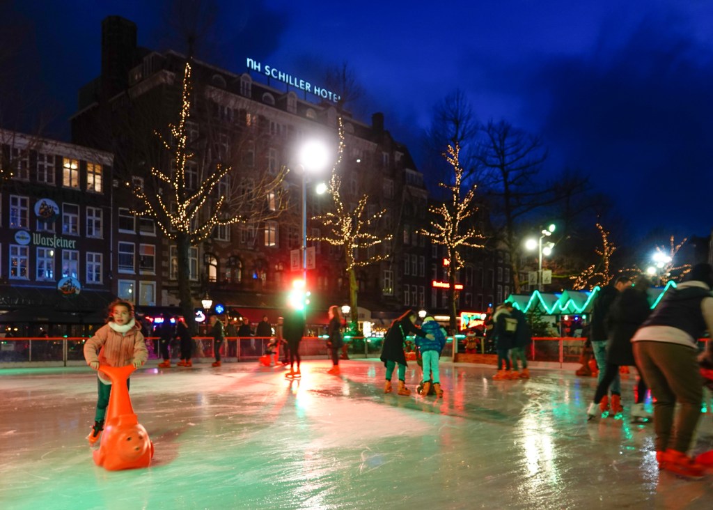 Dan maar met de tram terug naar het CS. Daarvandaan waren we verzekerd van de route. Vanuit de tram zagen we opeens weer appende mannetjes op de Herengracht. We stapten op het Rembrandtplein gauw uit de tram om daar dan toch maar de route op te pakken. De ijsbaan daar was té leuk om zomaar langs te lopen.