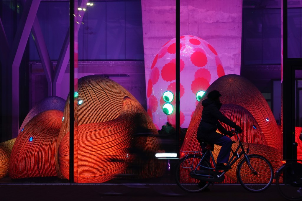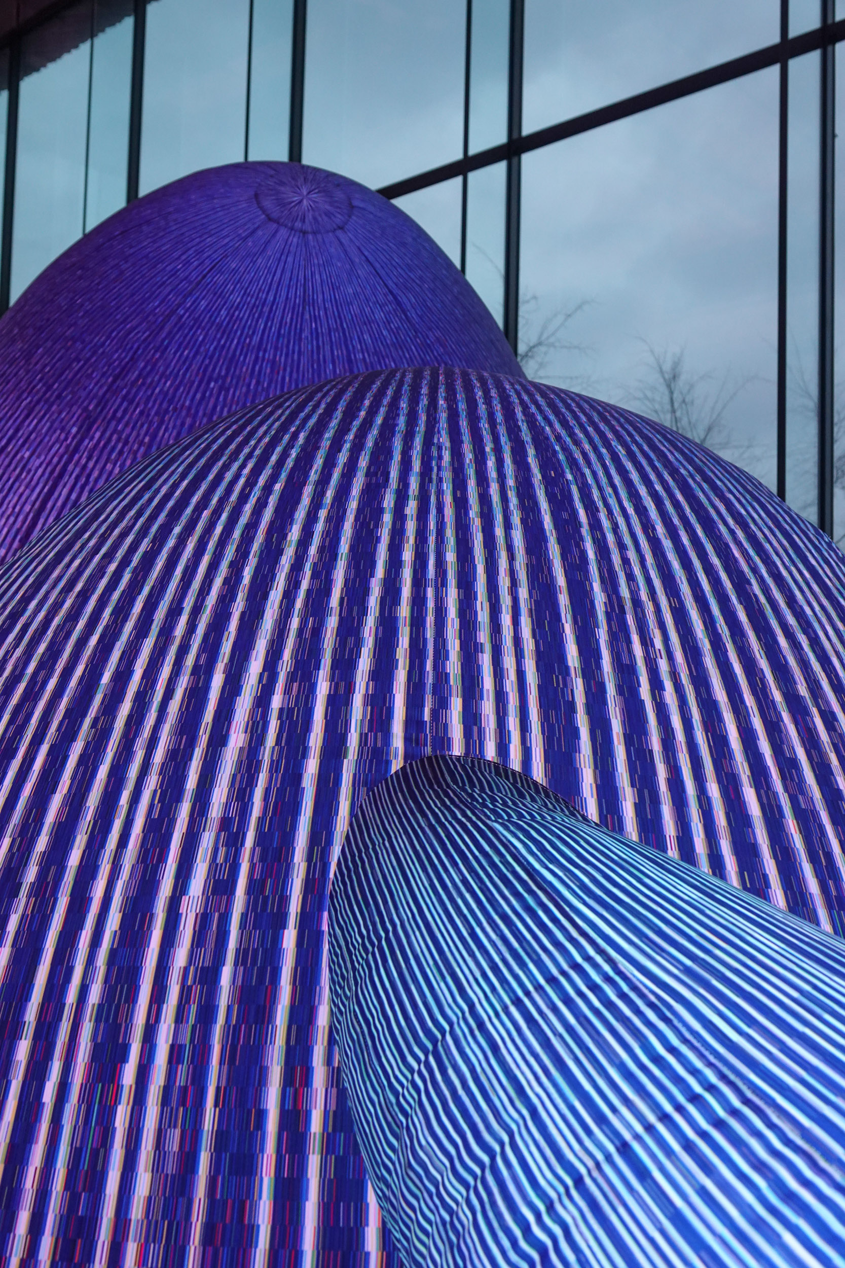 Daar hadden ze binnen een installatie gebouwd. Het was er een met een hoog knuffelgehalte. Het leek of het bollen wol waren. Je mocht ze aanraken, aaien of tegenaan liggen. Dat werd dan ook veel gedaan. Vooral bij kinderen was het heel geliefd.
