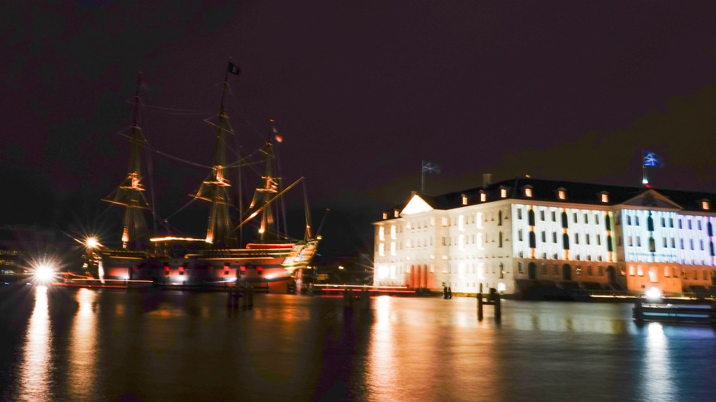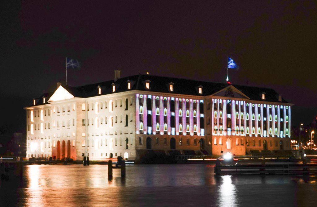 Ook op het Scheepvaartmuseum werden lichtbeelden geprojecteerd. De stromende beweging is niet over te brengen via een foto.