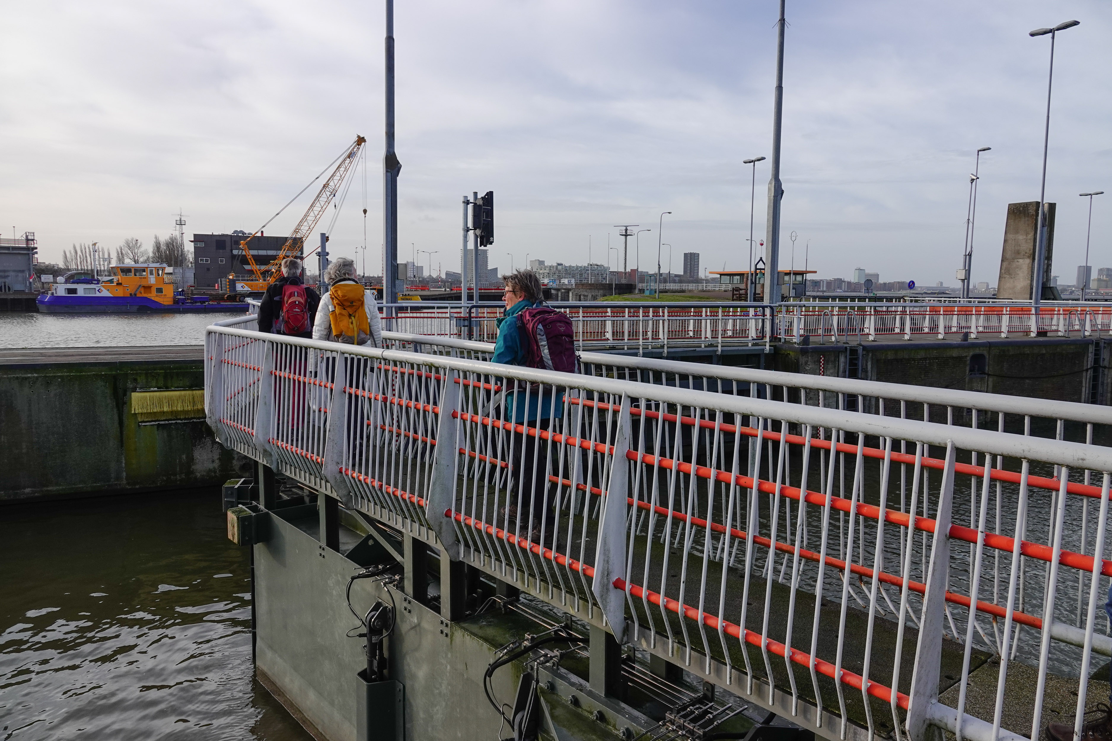 Dan zien we de Oranjesluizen liggen. Als de sluizen gesloten zijn is het een prima voetgangersverbinding met de overkant. We hadden geluk. De sluisdeuren waren bijna dicht,
