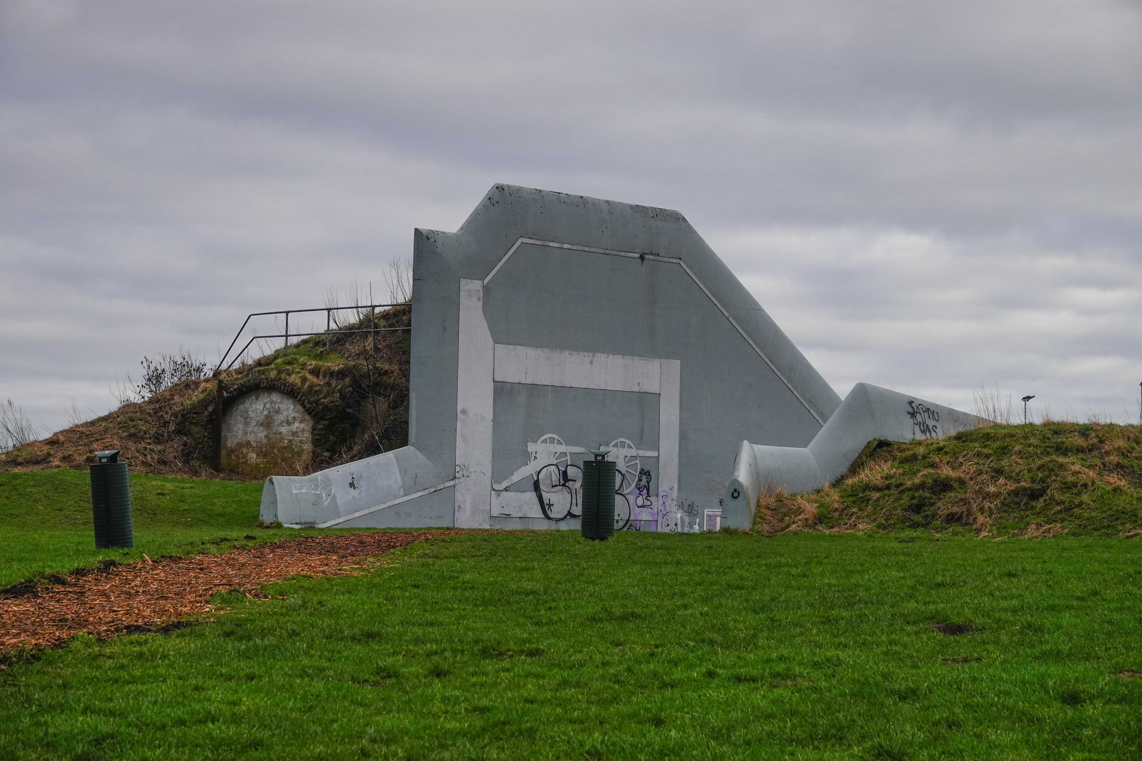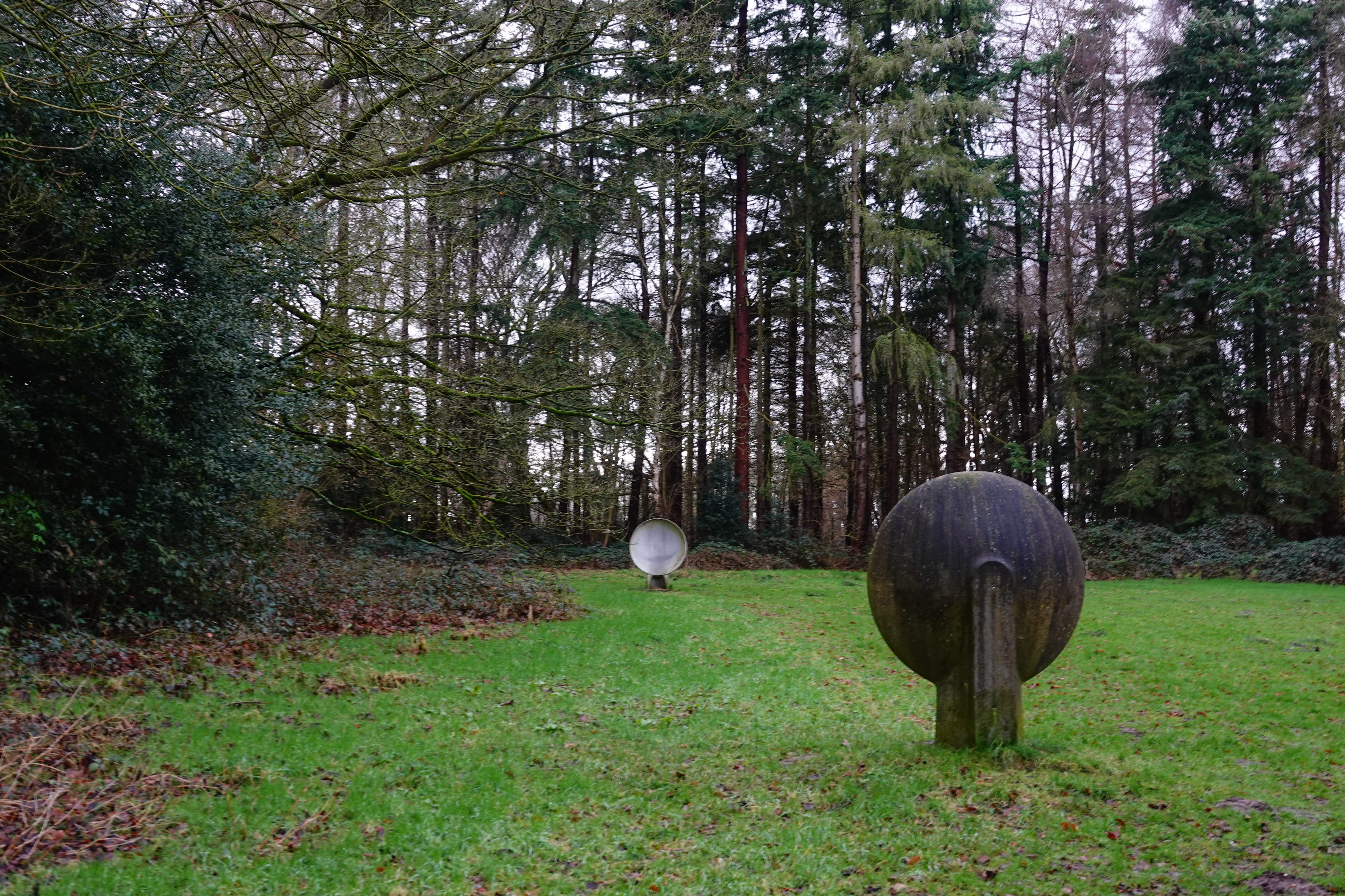 In het Echobos, dat zijn naam ontleent aan de echomuur achter het poortje, staan een paar akoestische reflectoren en een aantal spreekbuizen op een speelweide.