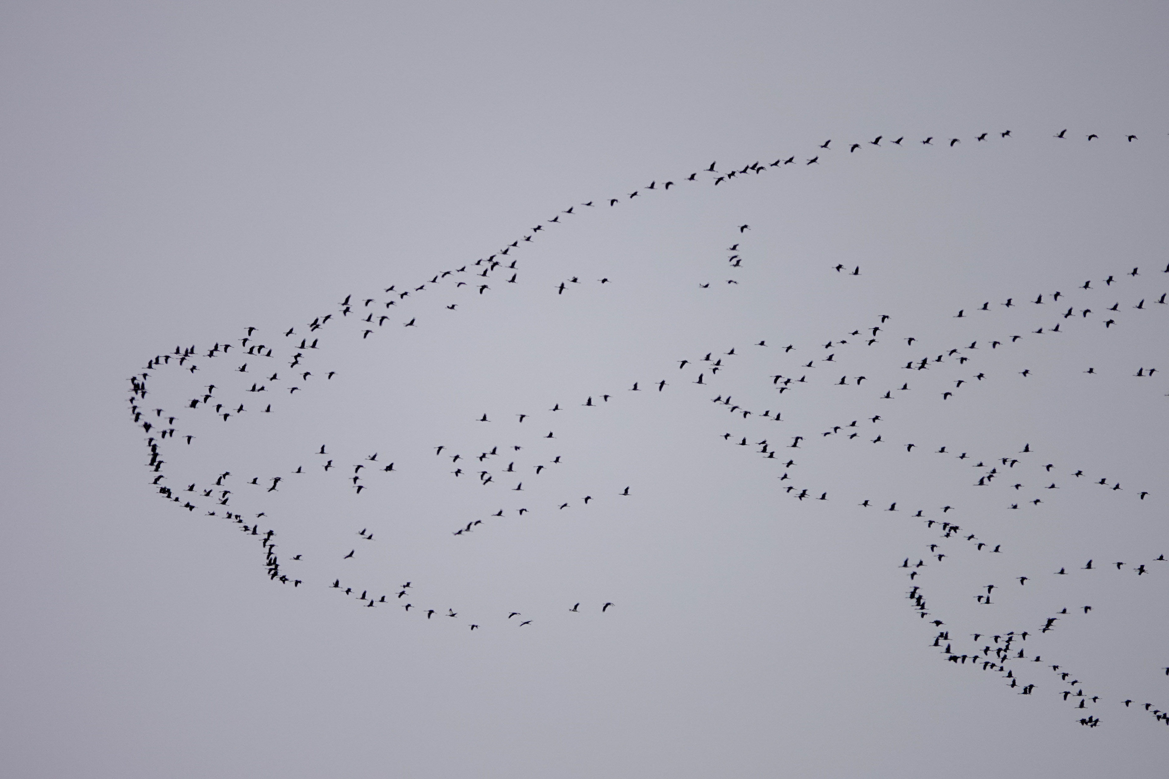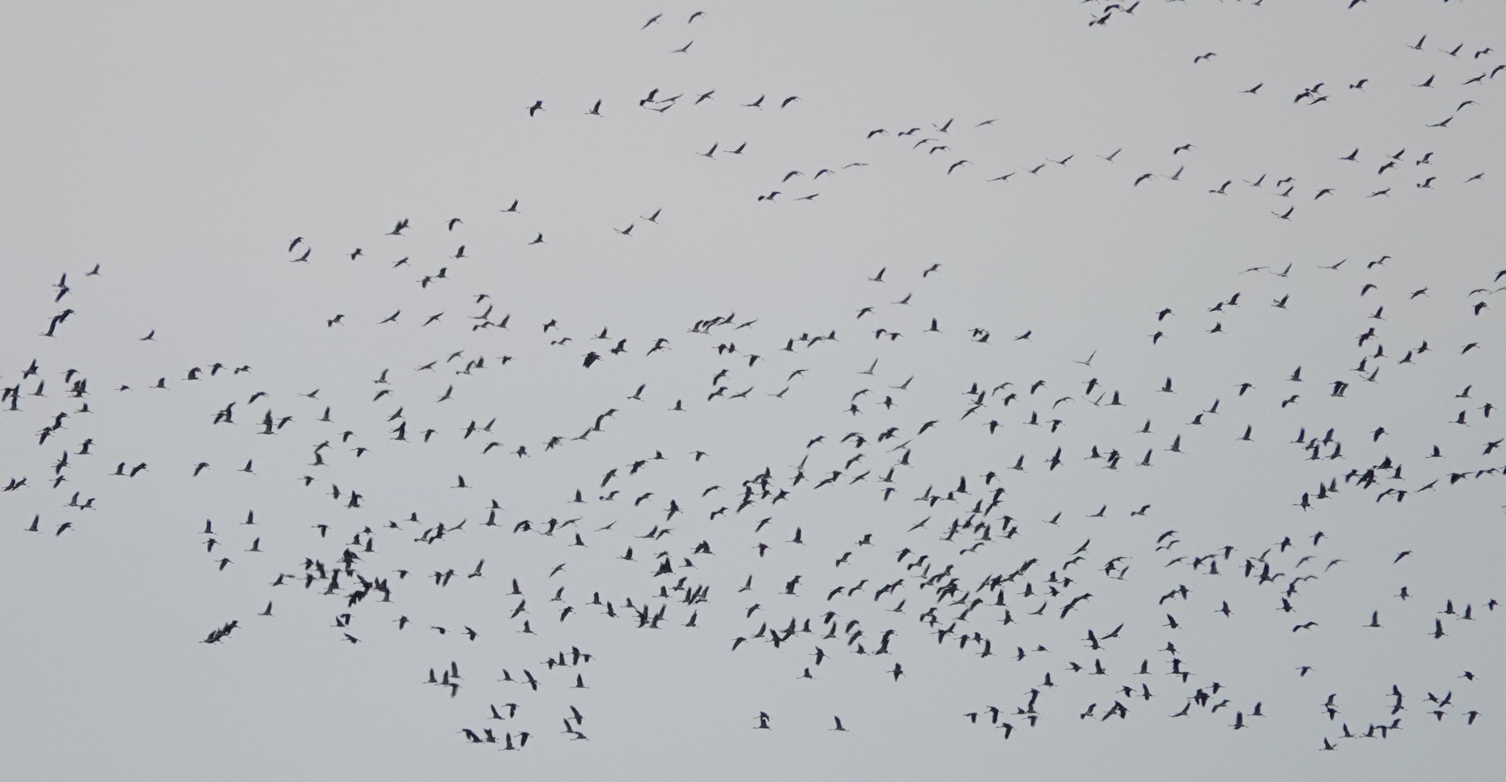 Dat was de verzamelplek van de kraanvogels, waarvandaan zij nu dagelijks met duizenden tegelijk vertrekken naar hun zomerverblijven. Daar waren we dus getuige van, vele dagen achter elkaar.