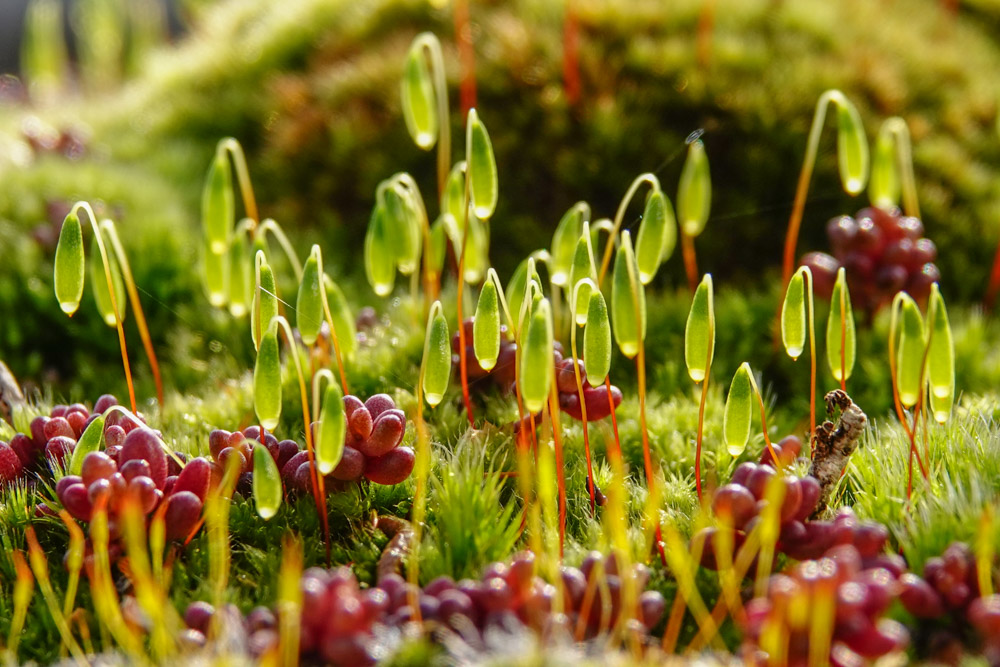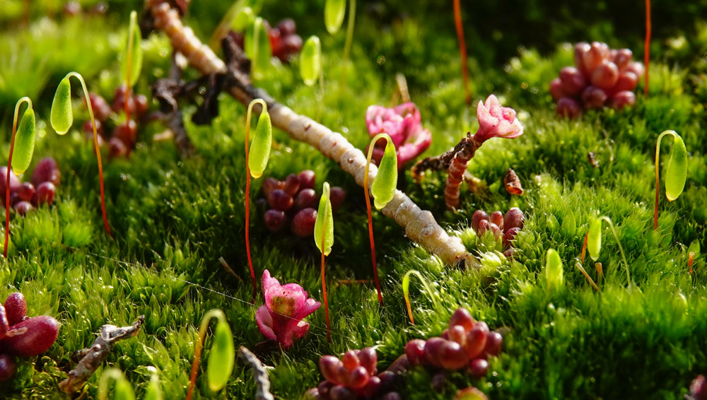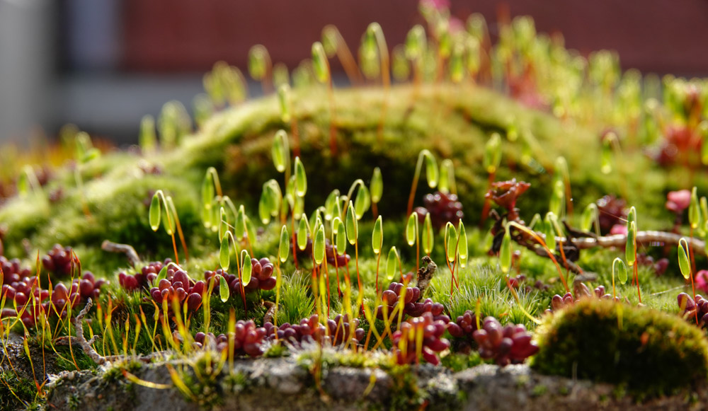 Op de rand van mijn balkon staan twee bakken met mos-soorten. In het vroege voorjaar zie je er opeens allerlei groei en bloemetjes in. Leuk om te proberen daar wat macrofoto’s van te maken. Het zijn net allemaal kleine landschapjes.