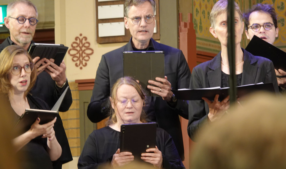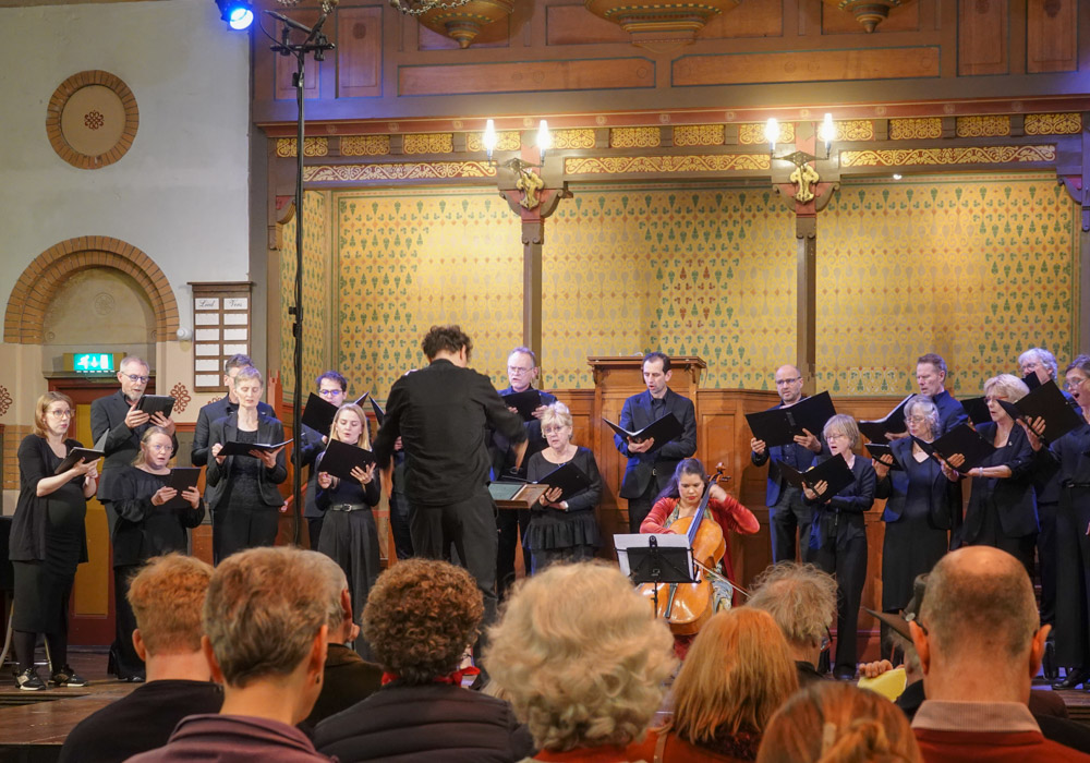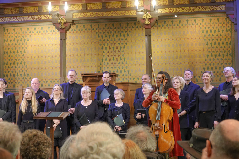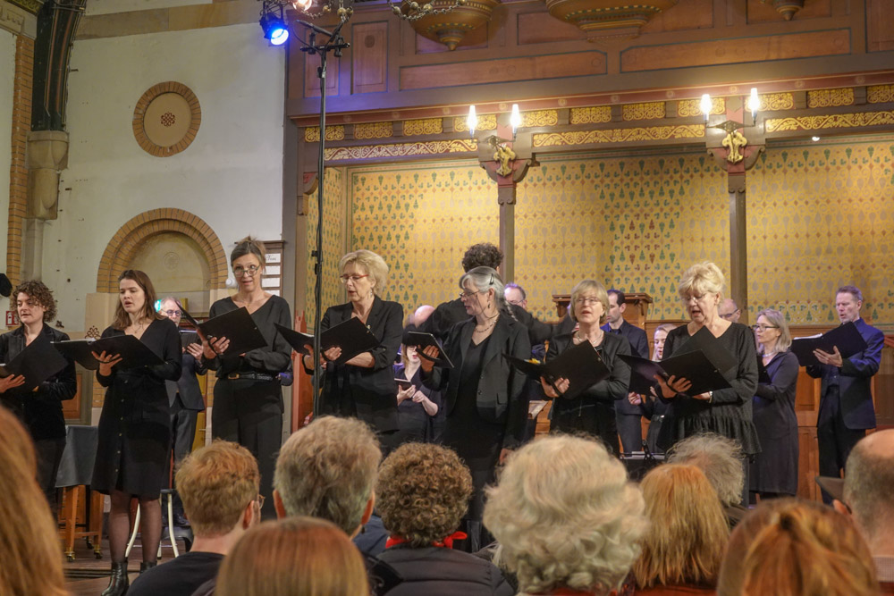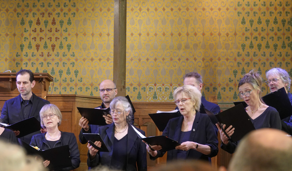 Een mooie samenklank werd dat. We hoorden liederen van o.a. Claudio Monteverdi, Knut Nystedt, Johannes Brahms en het meest bijzondere vond ik het lied ‘When the violin’, van Reena Esmail. Dit laatste was een Perzisch lied uit de 14e eeuw, gebaseerd op een zgn. Hindoestaanse raag. Dit is een vaste opeenvolging van tonen, die een gevoel willen uitdrukken. Het was heel indrukwekkend gedaan, maar moeilijk in woorden uit te leggen, wat klanken kunnen overbrengen.