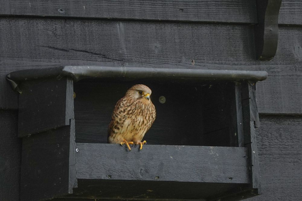 Vandaag kwam ex-collega H langs, getooid met verrijkijker. Die kon meteen uit de tas, want we waren het dorp nog niet uit en we zagen al een torenvalk in een nestkast zitten. Toevallig wist ik, dat er een paartje de nestkast aan het verkennen was. Van grote afstand kreeg ik één van de twee in het vizier. Ze zijn superschuw dus je moet wel afstand houden.
