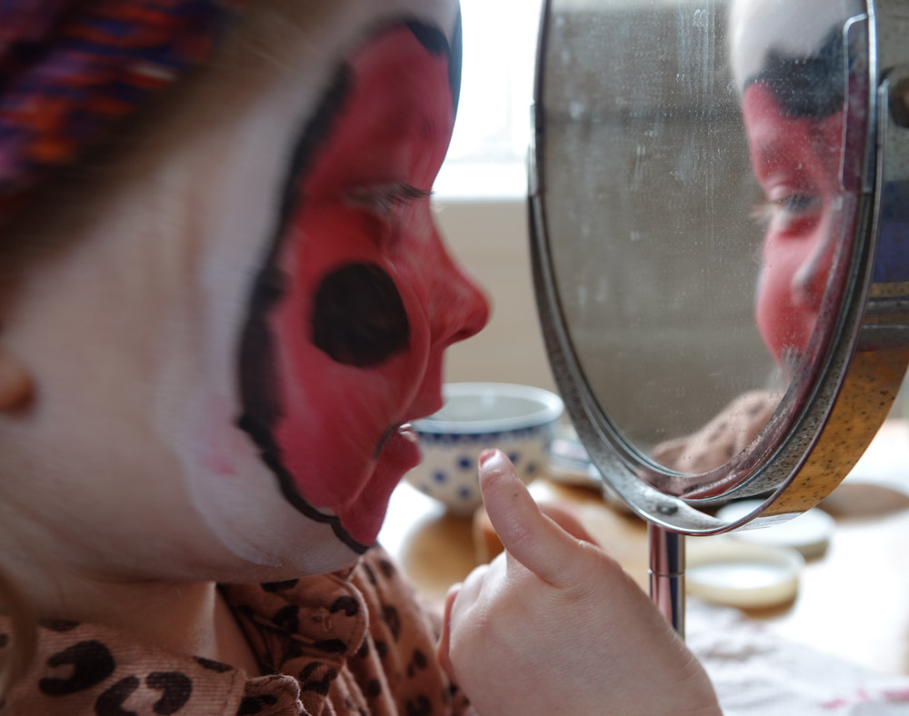 De laatste tijd werden de oppasdagen steevast afgesloten met een schminck-partij. Vandaag moest het een lieve-heers-beestje worden. Ik vind het een feest om te doen en als je dan ziet hoe je kleinkind helemaal opgaat in het ‘lieve-heers-beestje zijn, is dat zo genieten!
