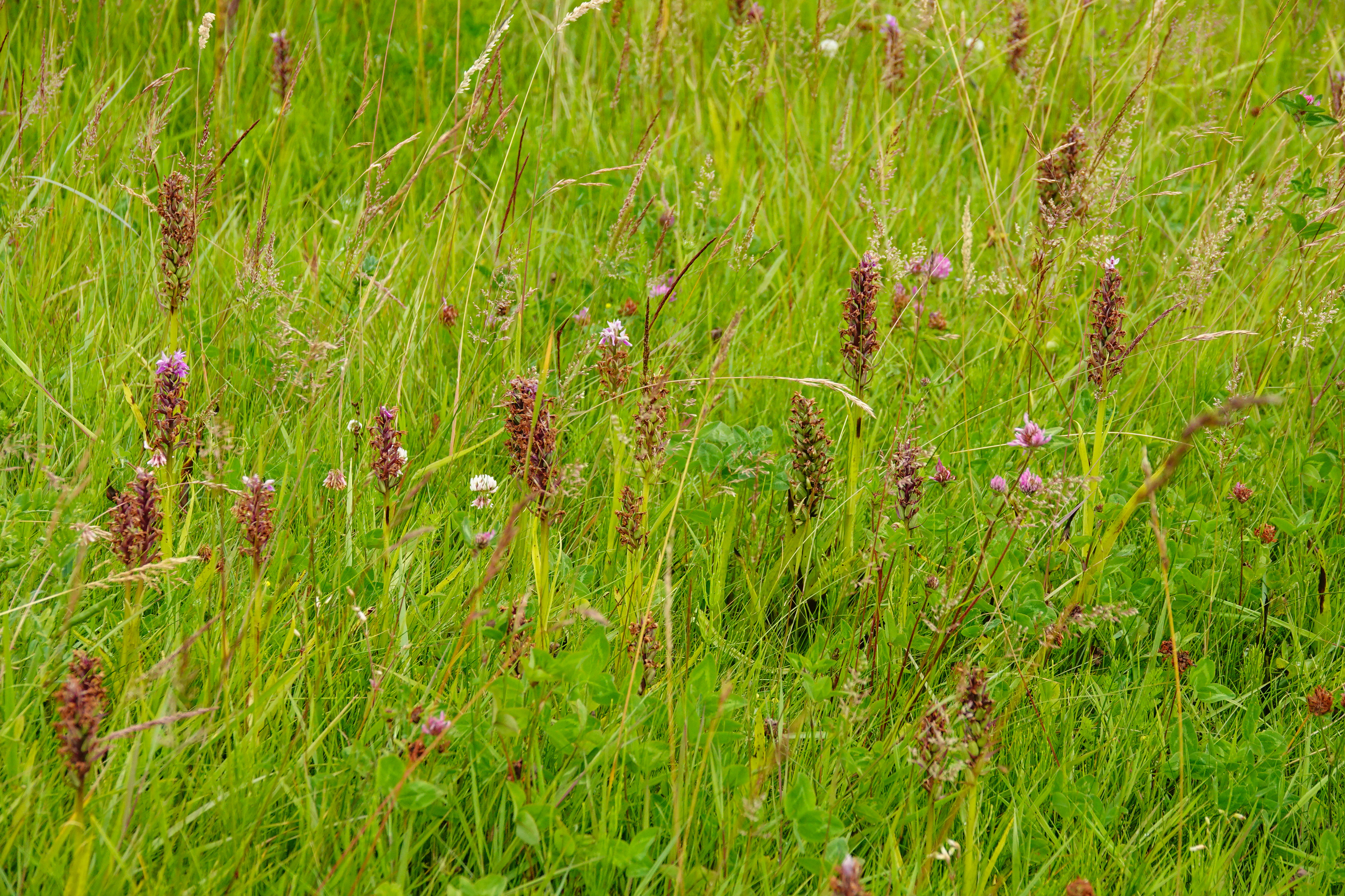 Door een bloemenweitje met oa. veel uitgebloeide orchideen en prachtig bloeiende chichorei