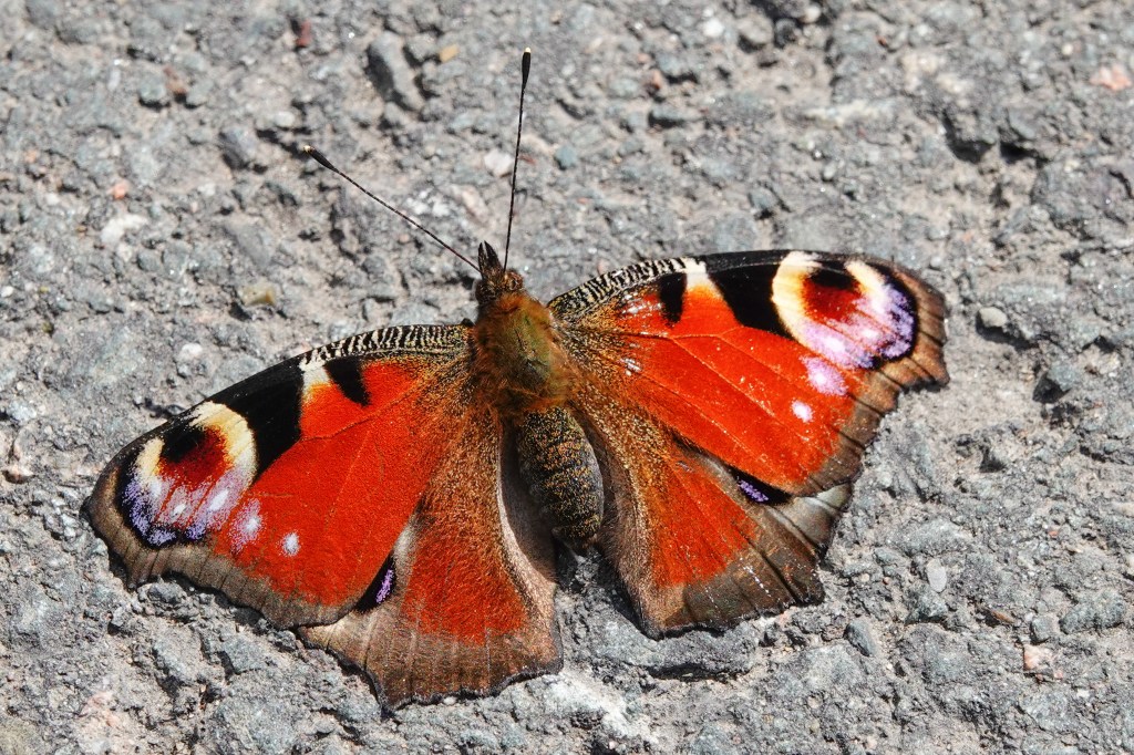 Op de terugweg naar huis zat een mooie dagpauwoog op het wegdek onverstoorbaar van de zon te genieten.