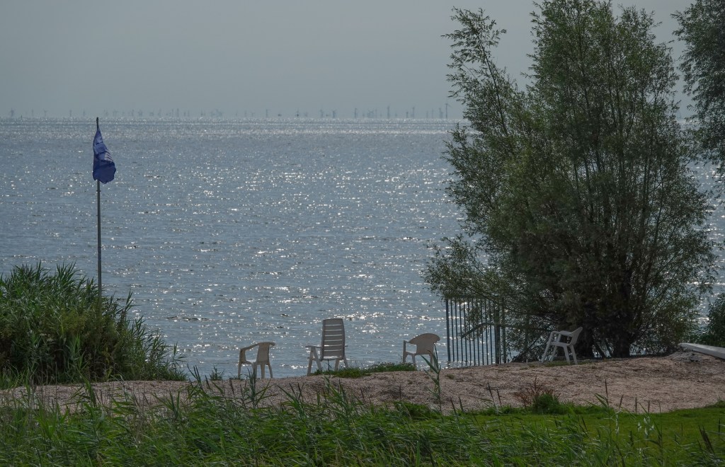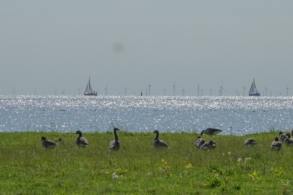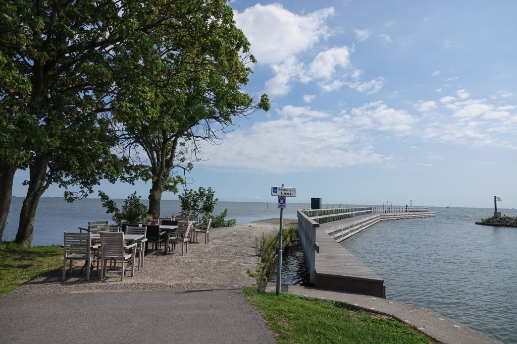 Maandagochtend vertrokken we onder een strakblauwe lucht vanuit het Huis aan het Water voor een dijkwandeling bij Edam. Bij het mooie huis met de pilaren, vroeger ooit een hotel, kwamen we op de dijk. Daar vingen we nog het kleine beetje wind, dat er was.