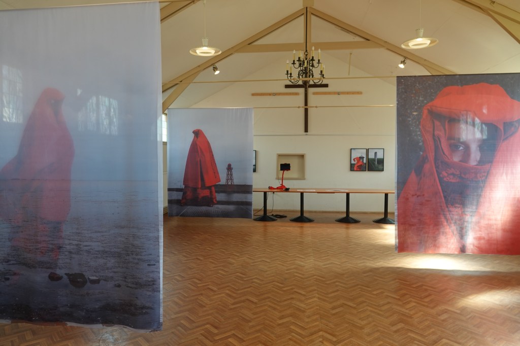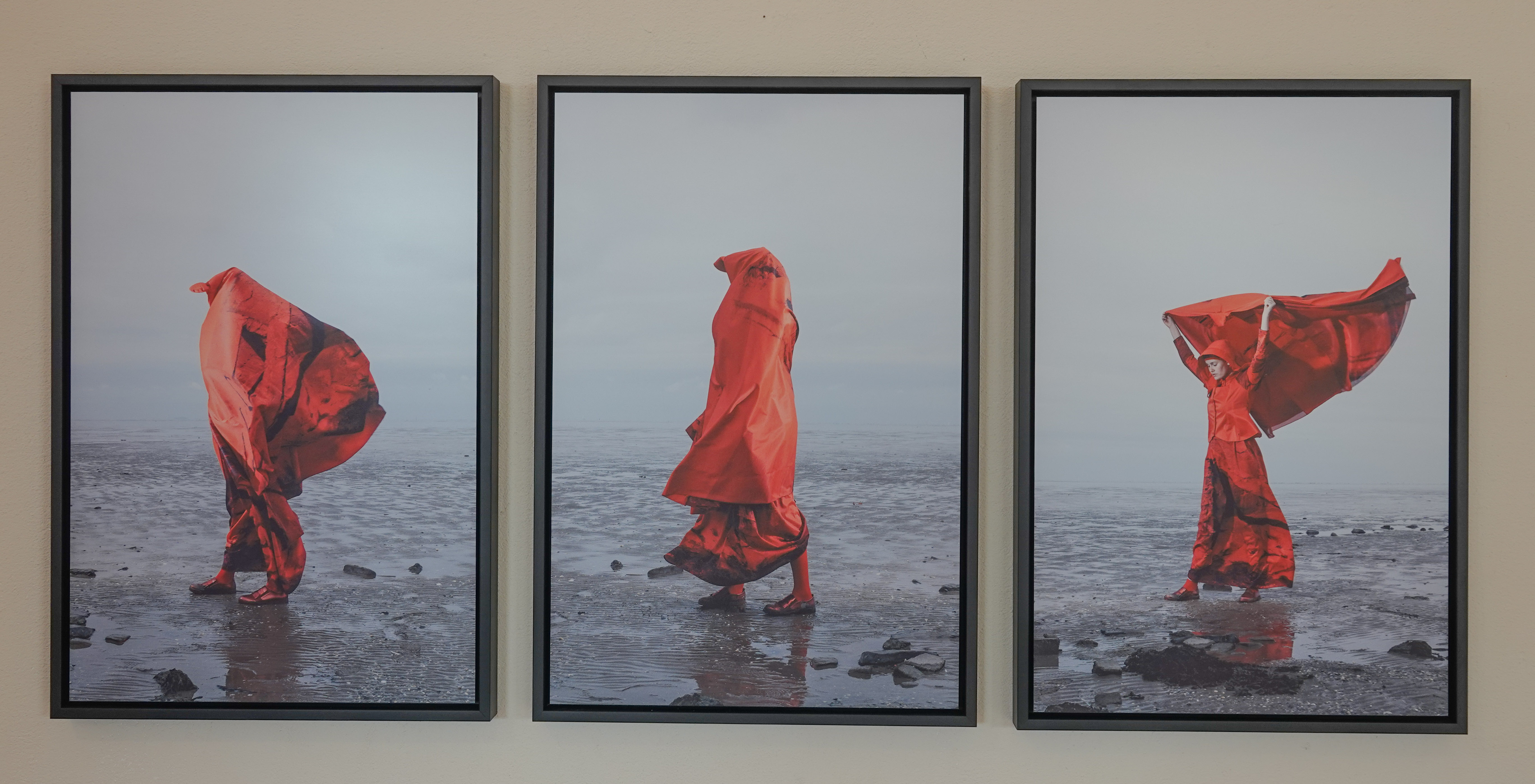 In het werk van Rem van den Bosch stond klederdracht centraal. De oude rouwdracht van Wieringen, kreeg vorm met nieuwe stof en vooral een nieuwe kleur. Er werden materialen hergebruikt, duurzame materialen ingezet, zoals de stoffen van gerecyclede petflessen. Mooi gespeeld met de kleur rood en verrijkt met motieven, die weer verwijzen naar het heden. De modellen zijn neergezet in het decor van de Waddenkust en het Wieringer landschap. Daarmee roept het een gevoel van mystiek en verwondering op. Op de achtergrond klinkt melancholische muziek, die de tekst van Rem vd Bosch ‘Wieringen eiland af’ begeleid. Het hele werk zet ook aan tot nadenken over de gevolgen van klimaatverandering voor mens en natuur. Een indrukwekkend geheel deze kunst, op deze plek.